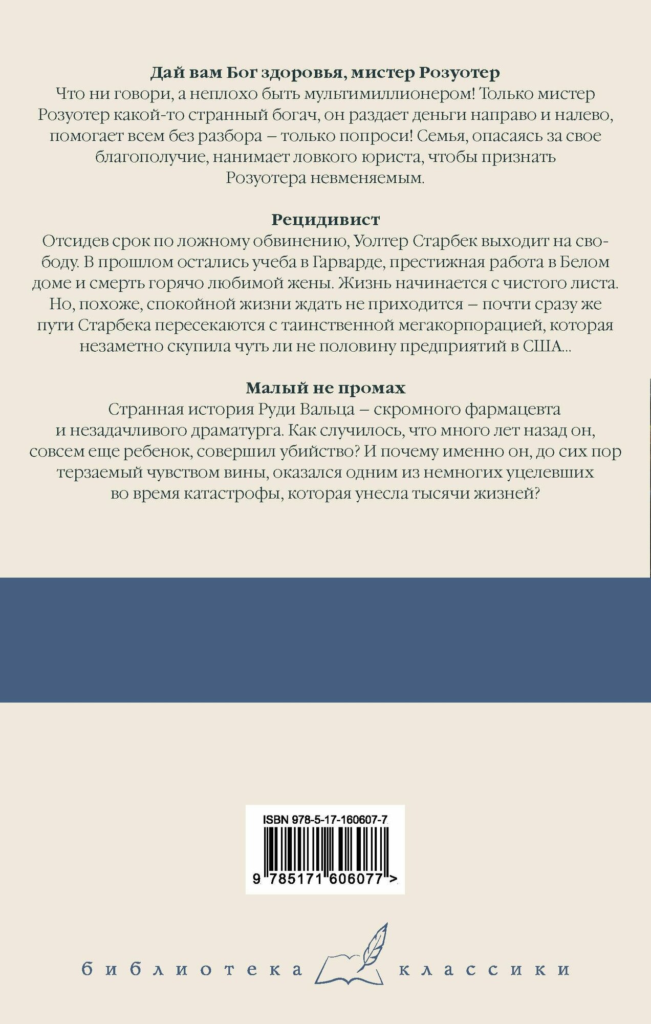 В сборник вошли романы "Дай вам Бог здоровья, мистер Розуотер", "Рецидивист" и "Малый не промах".