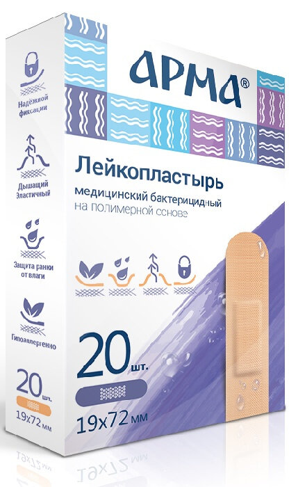 Лейкопластырь бактерицидный арма, 19х72мм полимерный телесный, 20 шт.Бактерицидный лейкопластырь предназначен для защиты небольших повреждений от дополнительного травмирования. Также он препятствует проникновению в ранку и размножения в ней бактерий. Кроме того, они должны быть незаметными, дышащими и не сковывающими движений.Лейкопластыри российского производства «Арма» совмещают в себе все преимущества современных лейкопластырей. Они выпускаются на современном итальянском оборудовании с использованием самого качественного сырья. Их особенности: эластичная дышащая основа производства Германии; нетканая подушечка, не прилипающая к ранке; пропитка-антисептик из хлоргексидина биглюконата; бежевый цвет. Размер бактерицидных лейкопластырей: 19*72 мм. Они фасуются в картонные упаковки по 20 штук.
