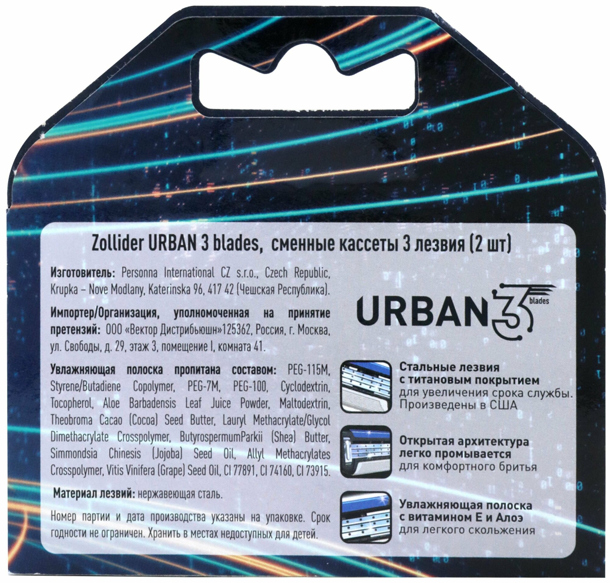Сменные кассеты к мужскому станку для бритья со сменными картриджами URBAN Lite от Zollider оснащены тремя стальными лезвиями с титановым покрытием производства США с особой технологией шлифовки. Обеспечивают идеально гладкое и чистое бритьё вне зависимости от жёсткости щетины. Смазывающая полоска с алоэ вера и витамином Е помогает защитить кожу от порезов и раздражений. Комплектация набора: 2 сменных картриджа.