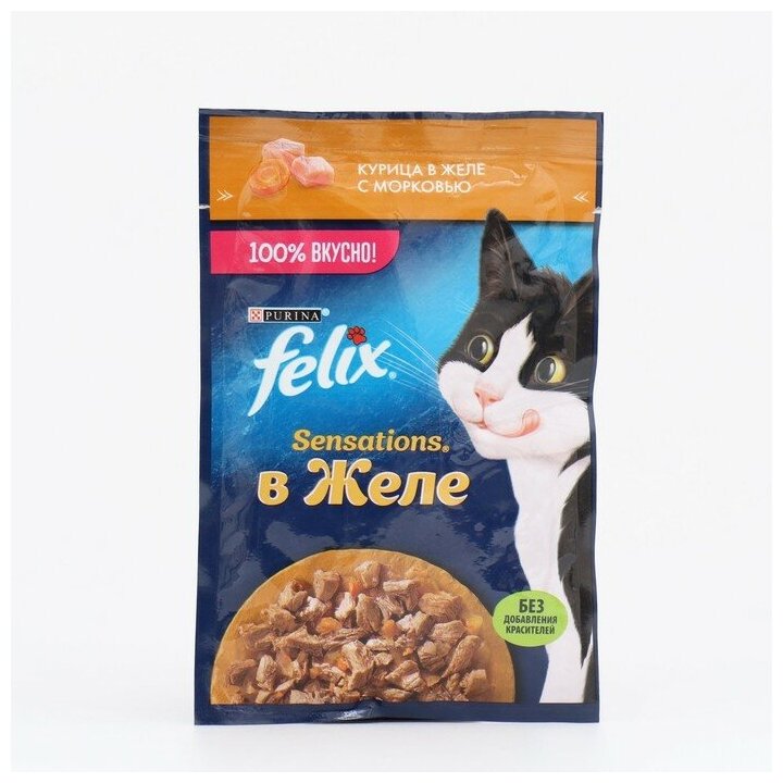 Felix Sensation - консервированный влажный корм для кошек в виде нежных сочных кусочков в аппетитном желе со вкусом курицы и моркови. Сбалансированный состав с Омега-6 жирными кислотами, белками и витаминами содержит все необходимое для ежедневного питания кошки.