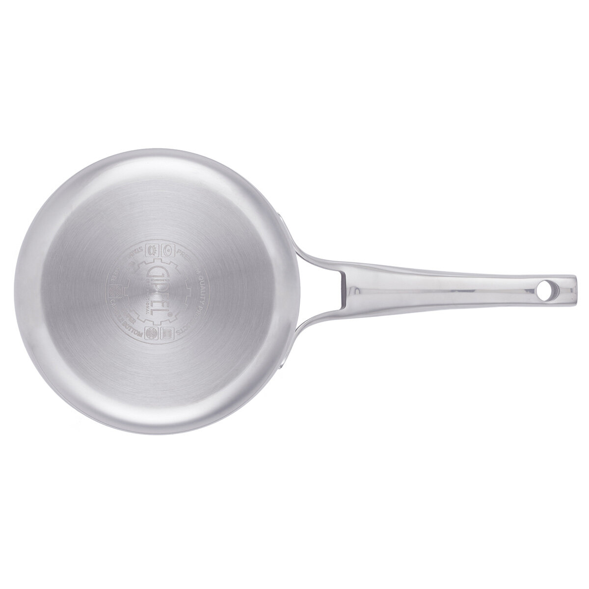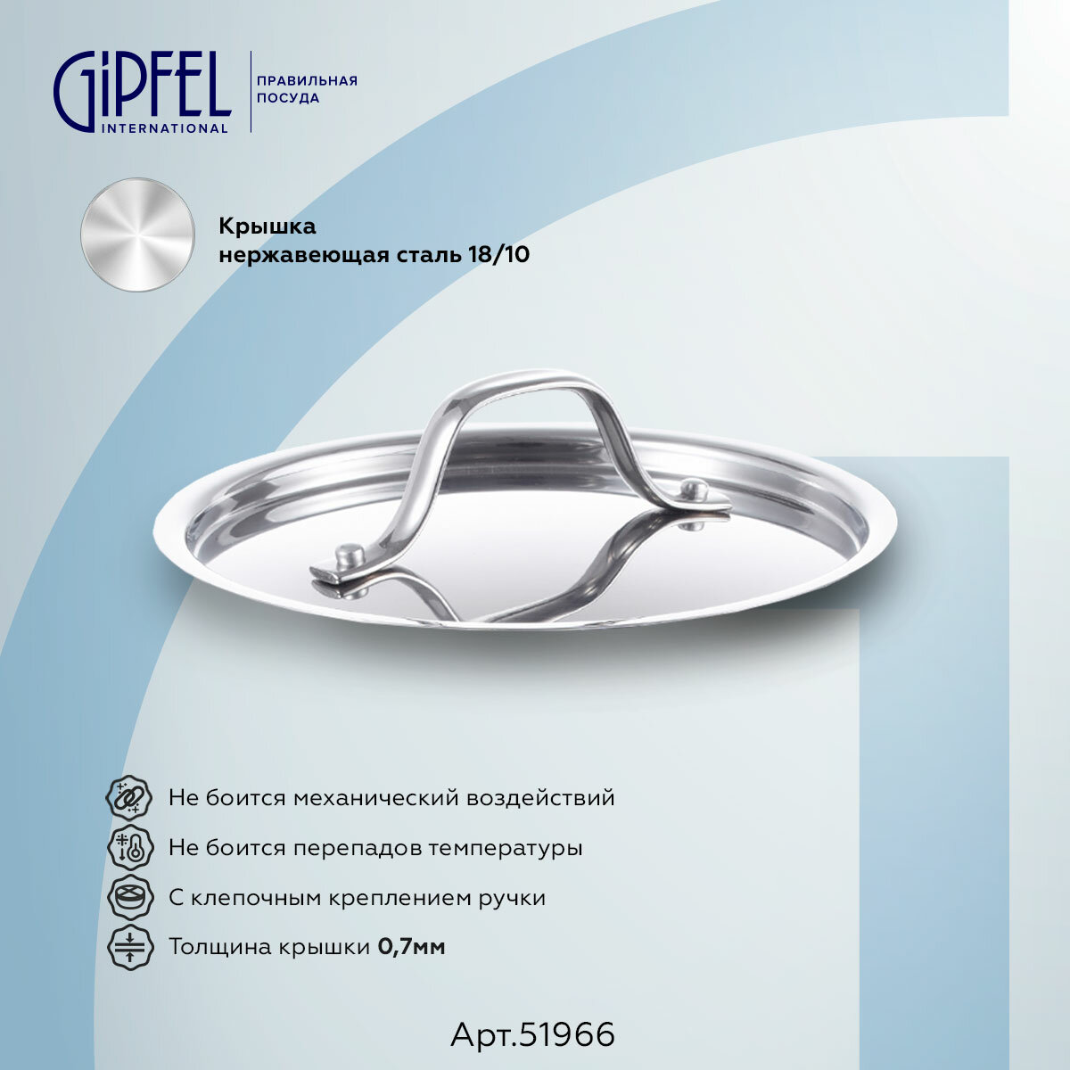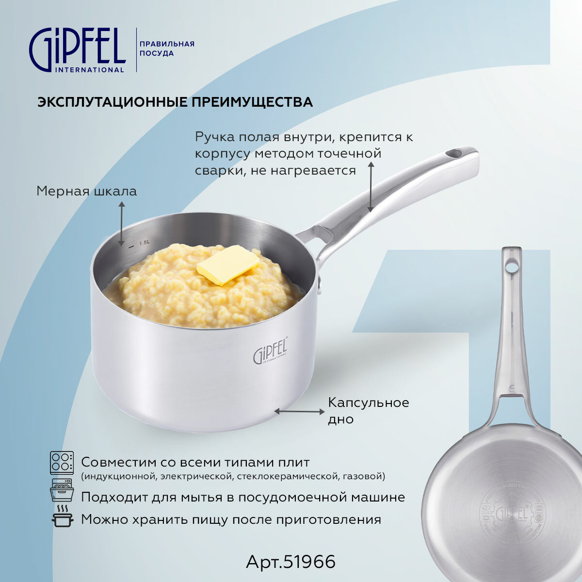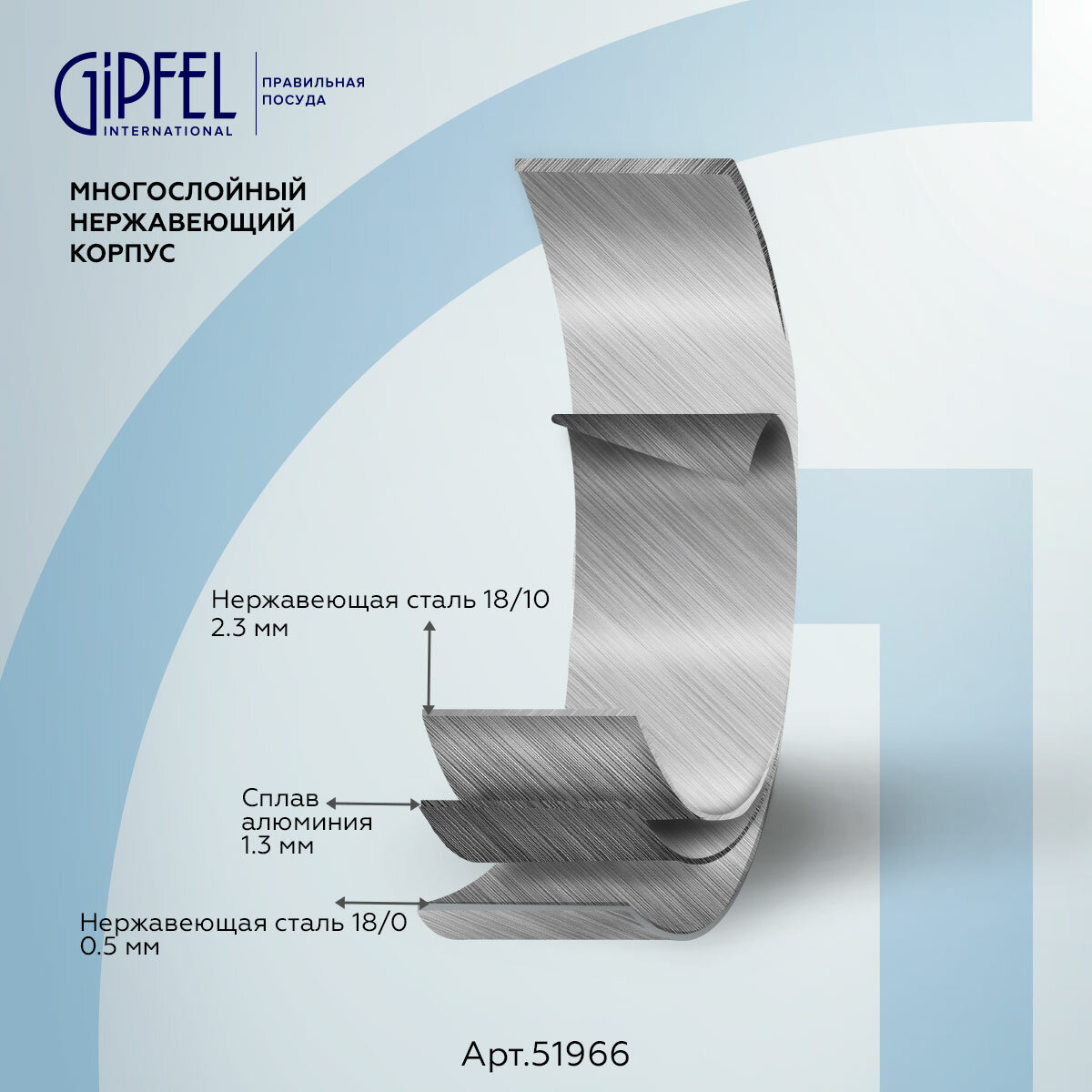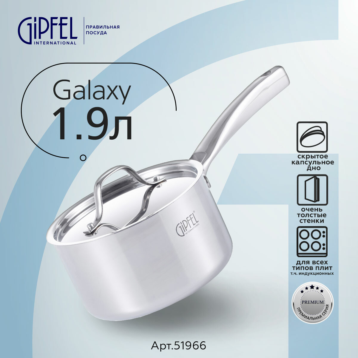 Ковш из нержавеющей стали Gipfel Galaxy 51966. Объем данной модели 1,9 л, диаметр 16 см, высота стенок 9,5 см. Толщина – 2,3 мм (нержавеющая сталь 18/10 (0,5 мм) + алюминий (1,3 мм) + нержавеющая сталь 18/0 (0,5 мм)). Толщина крышки – 0,7мм. Между слоями нержавеющей стали, которая с одной стороны соприкасается с поверхностью плиты, а с другой стороны контактирует с едой, заключен слой алюминия. Алюминий запаян внутрь стальной оболочки.