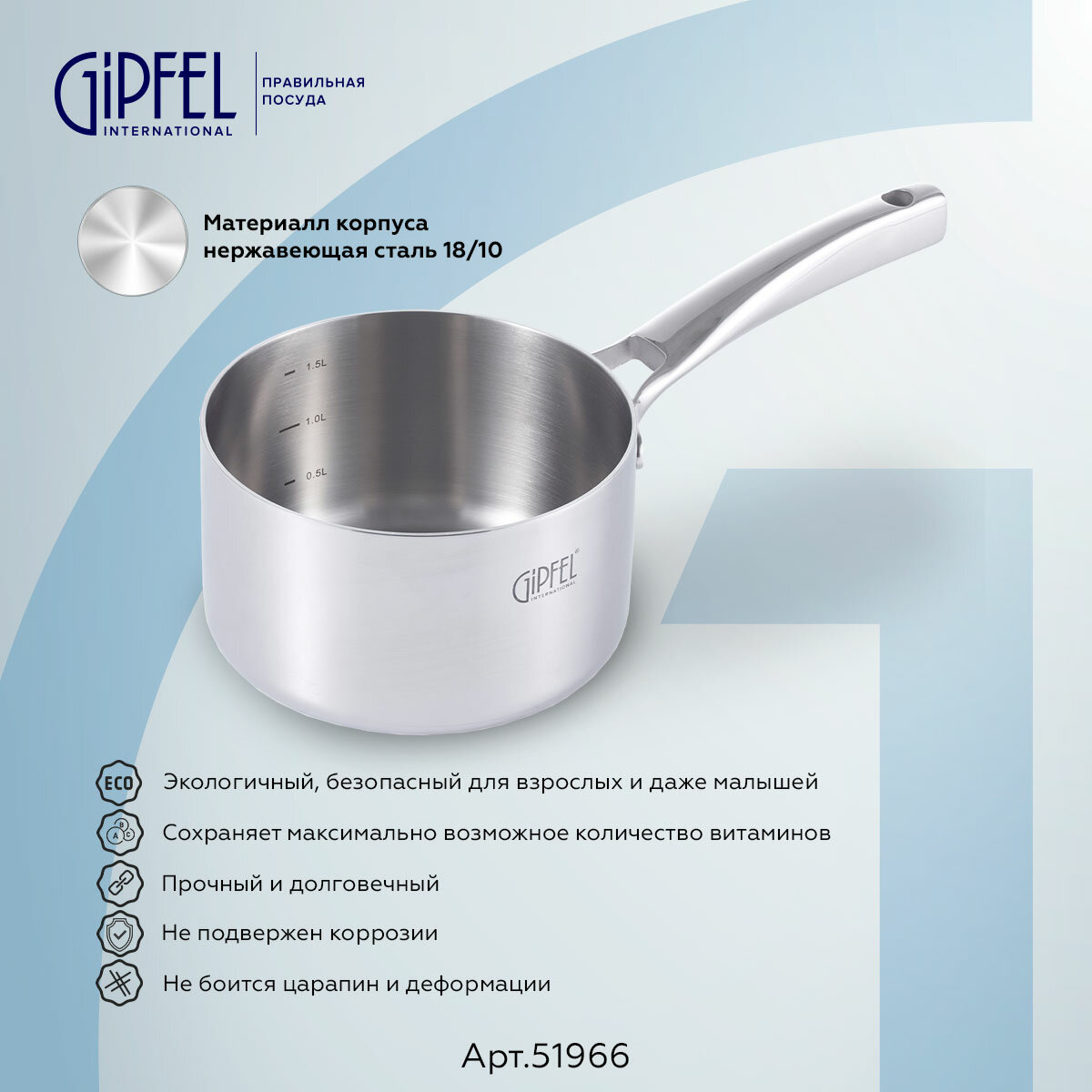 Ковш изготовлен из нержавеющей стали «18/10», что гарантирует его прочность и долговечность, а также гигиеничность посуды — отсутствие пор в данном материале исключает концентрацию вредных веществ. Этот ковш отлично подойдет для хранения еды после приготовления - вкус и полезные свойства пищи нисколько не пострадают.