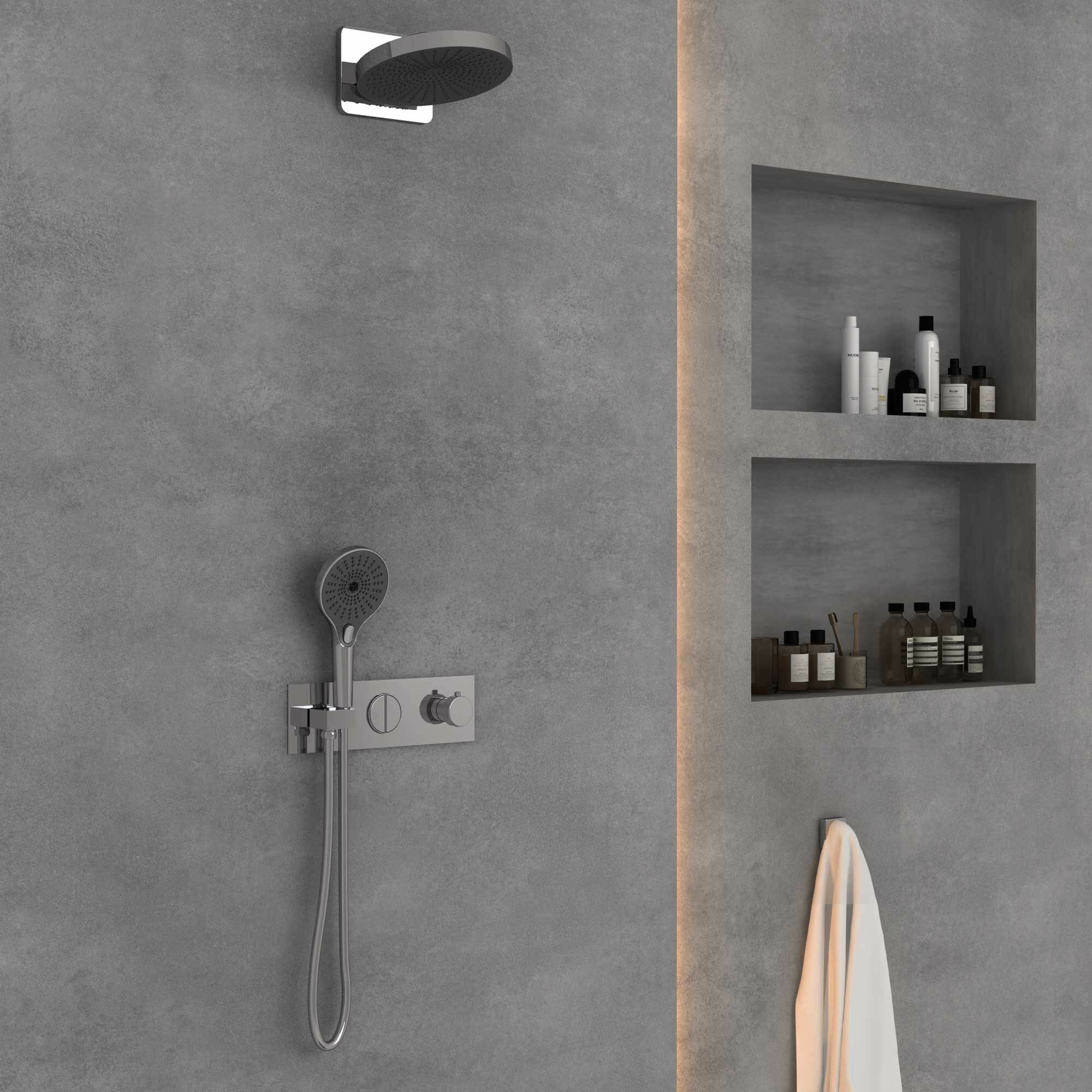 Комплектация: Верхний душ, ручной душ, смеситель со встраиваемой частью.