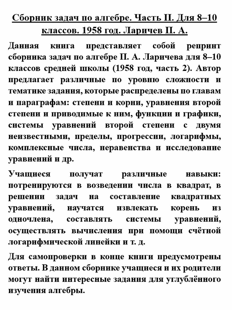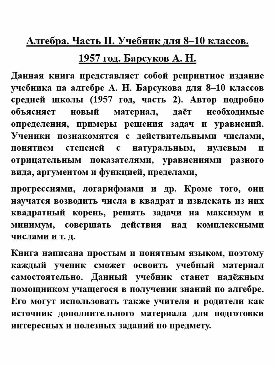 Данная книга представляет собой репринтное издание учебника па алгебре А. Н. Барсукова для 8–10 классов средней школы (1957 год, часть 2). Автор подробно объясняет новый материал, даёт необходимые определения, примеры решения задач и уравнений. Ученики познакомятся с действительными числами, понятием степеней с натуральным, нулевым и отрицательным показателями, уравнениями разного вида, аргументом и функцией, пределами,