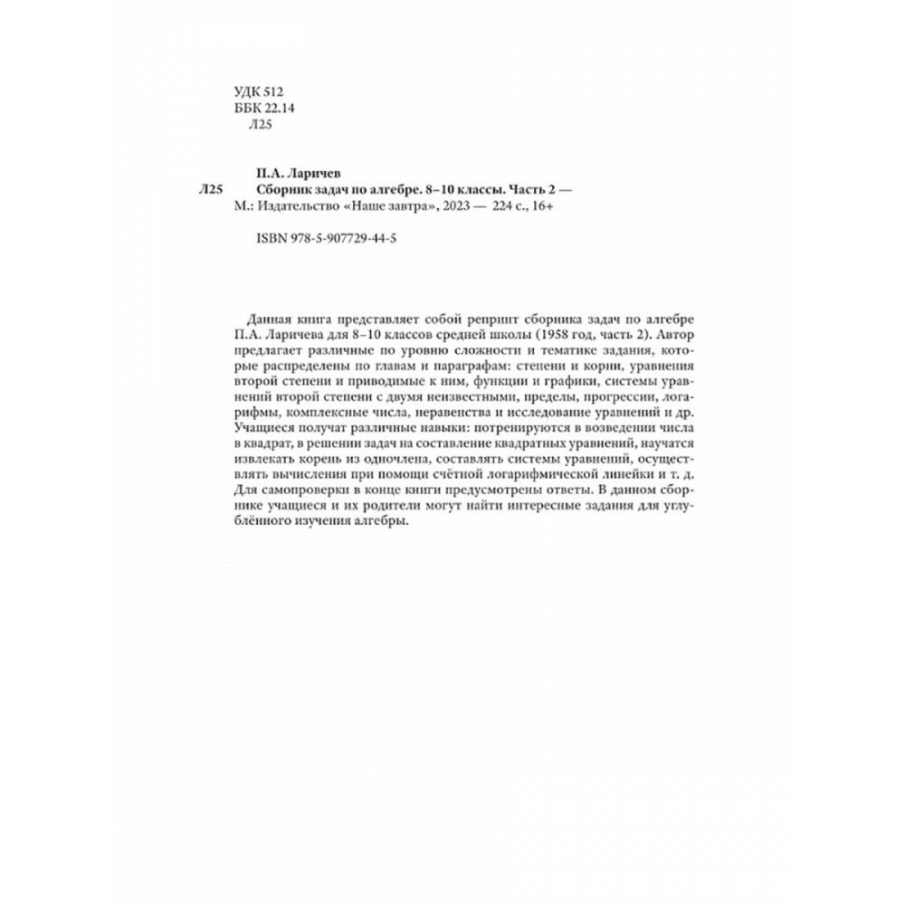 Данная книга представляет собой репринт сборника задач по алгебре П. А. Ларичева для 8–10 классов средней школы (1958 год, часть 2). Автор предлагает различные по уровню сложности и тематике задания, которые распределены по главам и параграфам: степени и корни, уравнения второй степени и приводимые к ним, функции и графики, системы уравнений второй степени с двумя неизвестными, пределы, прогрессии, логарифмы, комплексные числа, неравенства и исследование уравнений и др.