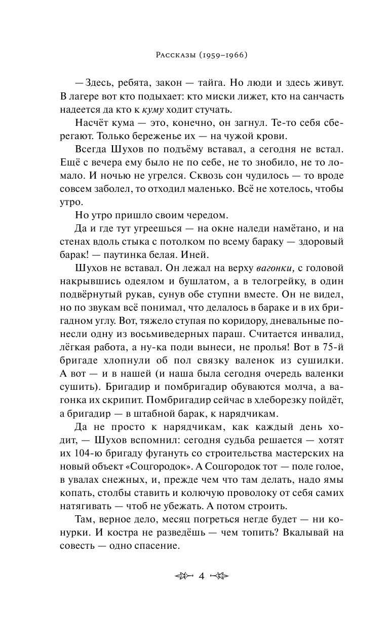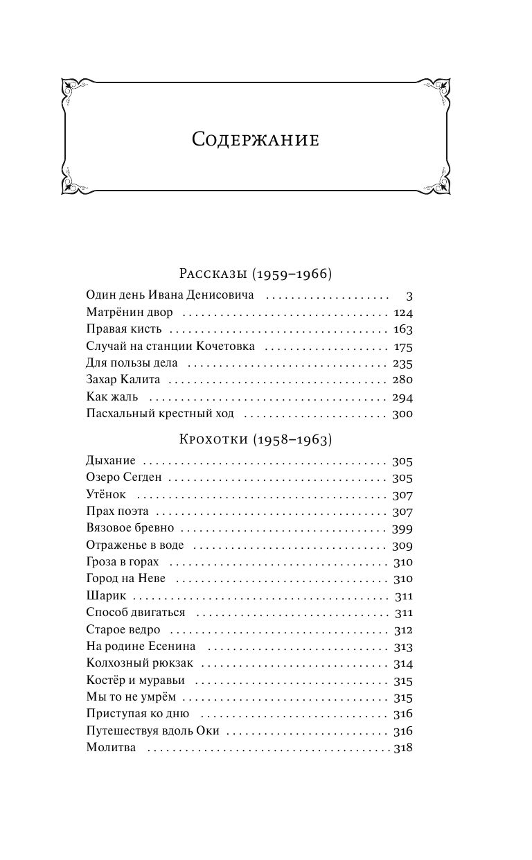 Александр Исаевич Солженицын (1918—2008) — русский писатель, лауреат Нобелевской премии (1970), лауреат Государственной премии Российской Федерации за выдающиеся достижения в области гуманитарной деятельности (2006). Болью и великой верой в сохранение человеческой души проникнуто все его творчество. В книгу вошли его знаковые рассказы 60-х годов «Один день Ивана Денисовича», «Матренин двор», «Правая кисть», «Захар-Калита», «Случай на станции Кочетовка» и миниатюры, названные самим автором «Крохотками» (1958—1963).