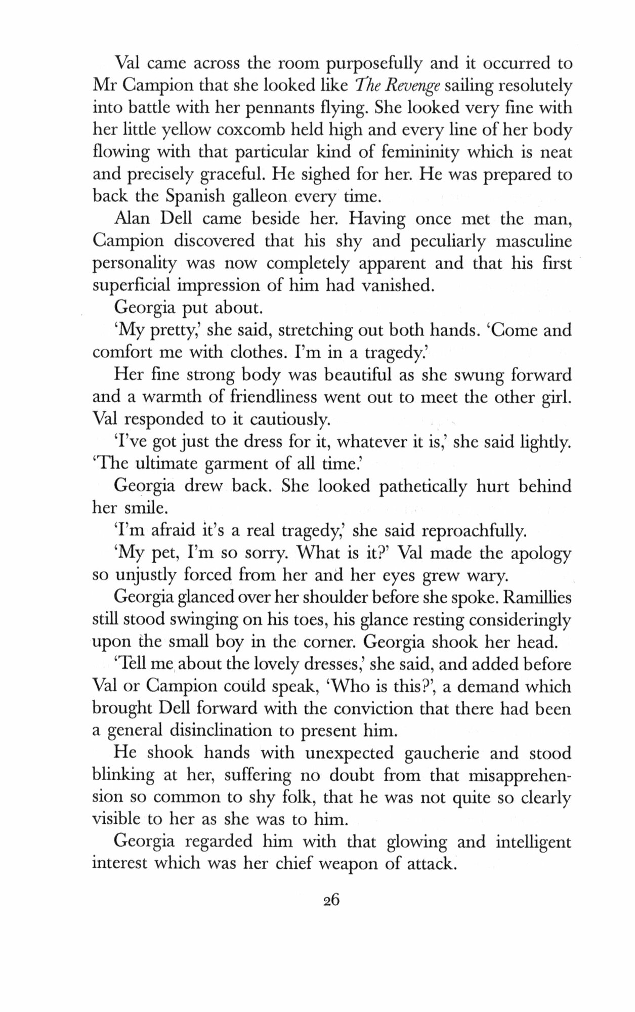 Both the skeleton and the corpse have died with suspicious convenience for Georgia Wells, a monstrous but charming actress with a raffish entourage. Georgia's best friend just happens to be Valentine, a top couturiere and Campion's sister. In order to protect Valentine, Campion must unravel a story of blackmail and ruthless murder.