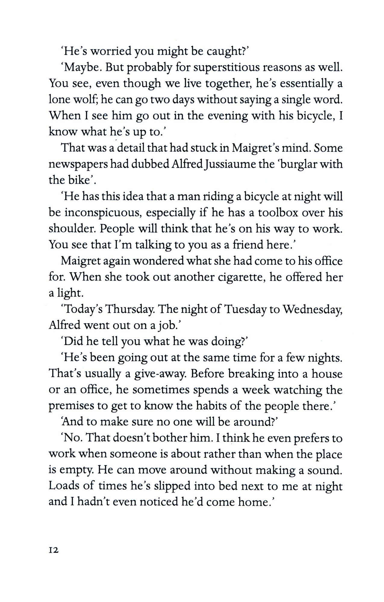 'When he had set them to work, Maigret had had a merry, almost fierce glint in his eye. He had set them loose on the house like a pack of hounds on the trail of a scent, encouraging them not with his voice, but by his whole attitude . . . would events have played out in the same manner, if the man from Rue de la Ferme hadn't been a heavyweight like him, both physically and psychologically?'