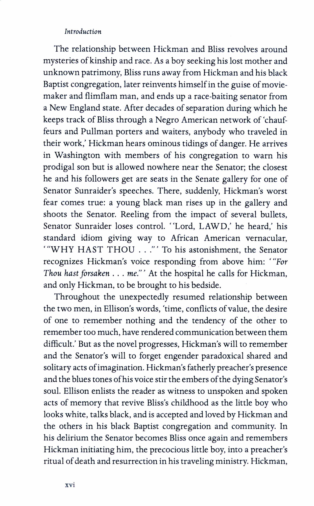 'Tell me what happened while there's still time,' demands the dying Senator Adam Sunraider to the itinerate black baptist minister he calls Daddy Hickman. As a young orphan, Sunraider was taken in and raised by Hickman, before reinventing himself as a racist politician. Now, as the two men confront the truth about their shared past in a final reckoning, Ellison's masterly novel takes in memories of a southern childhood, the rhythms of jazz and gospel and the richness of the African-American experience.