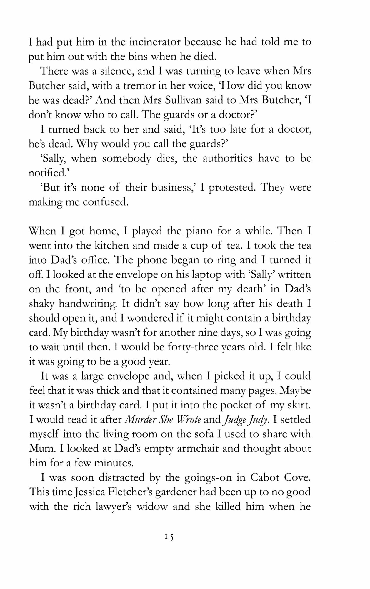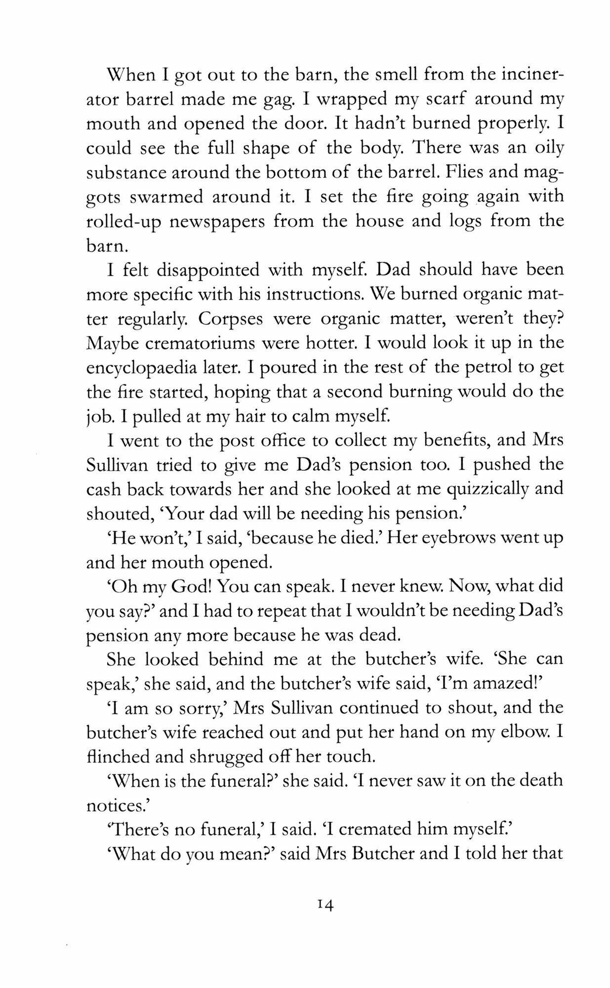 Sally Diamond cannot understand why what she did was so strange. She was only doing what her father told her to do, to put him out with the rubbish when he died.