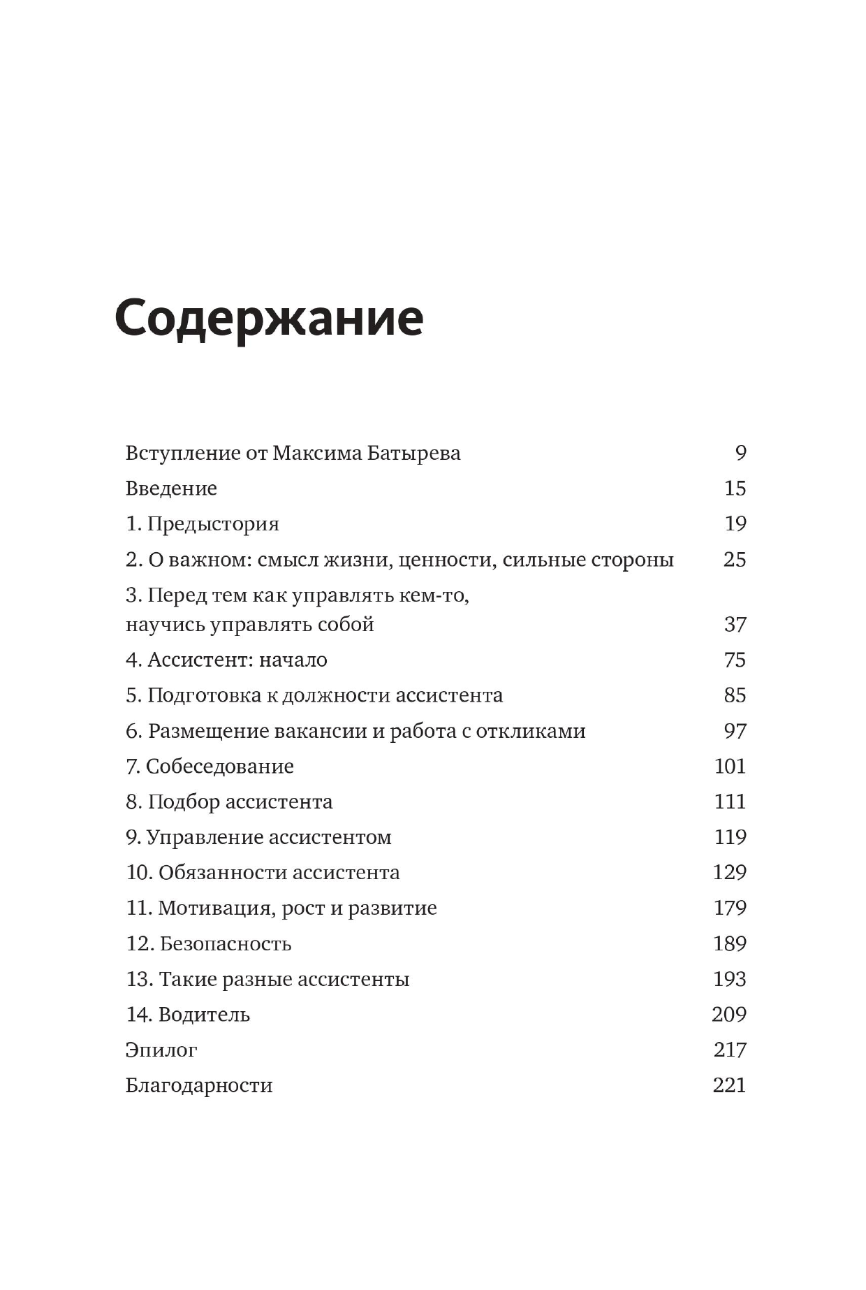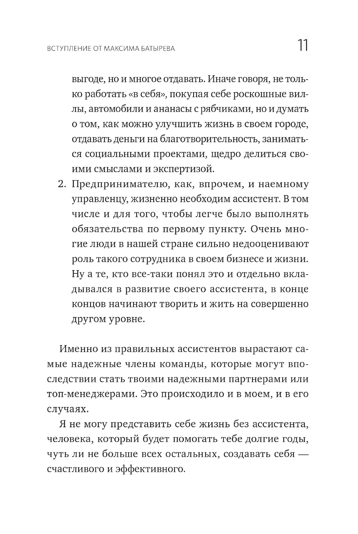 Книга Максима Батырева и Александра Шевченко — о том, как найти надежного и адекватного помощника, грамотно делегировать дела и довериться новому подчиненному. Работа каждого руководителя подразумевает высокий уровень самоорганизации как в профессиональной, так и в личной сфере. Но по мере развития бизнеса и расширения зоны ответственности становится сложнее держать всё под контролем. Каждый руководитель рано или поздно сталкивается с потоком рутинных и административных дел, отнимающих время у действительно важных задач бизнеса. Чтобы расти дальше, нужен личный ассистент, который возьмет все заботы на себя. Эта книга о том, как грамотно подойти к работе с ассистентом. Вы узнаете: какой помощник нужен лично вам; как тестировать кандидатов и выбрать из них лучшего; как делегировать дела и довериться новому подчиненному. Личный ассистент — не прихоть, а ваше главное вложение в профессиональный и личный успех. Для кого книга Для руководителей любого уровня.