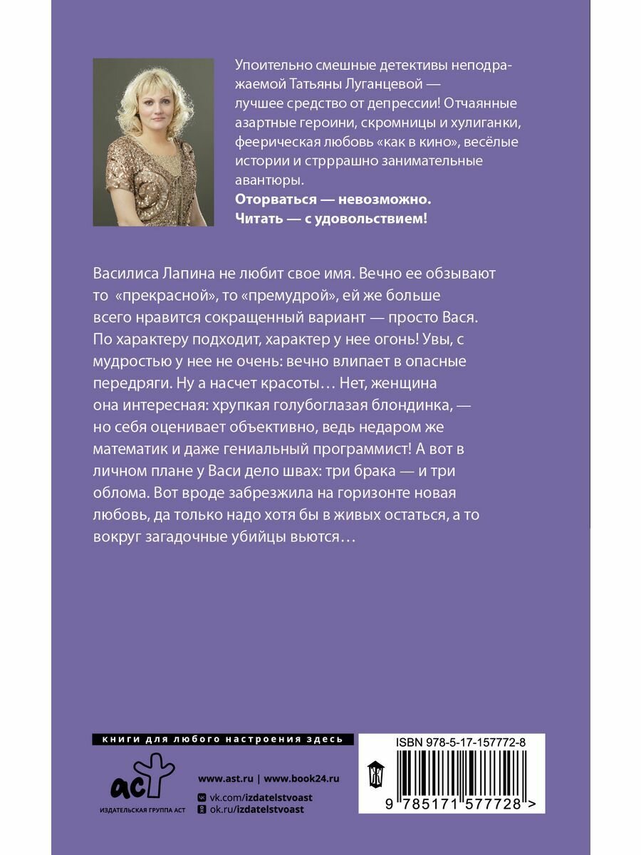 Василиса Лапина не любит свое имя. Вечно ее обзывают то "прекрасной", то "премудрой", ей же больше всего нравится сокращенный вариант – просто Вася. По характеру подходит, характер у нее огонь! Увы, с мудростью у нее не очень: вечно влипает в опасные передряги. Ну а насчет красоты… Нет, женщина она интересная: хрупкая голубоглазая блондинка, – но себя оценивает объективно, ведь недаром же математик и даже гениальный программист! А вот в личном плане у Васи дело швах: три брака – и три облома. Вот вроде забрезжила на горизонте новая любовь, да только надо хотя бы в живых остаться, а то вокруг загадочные убийцы вьются…