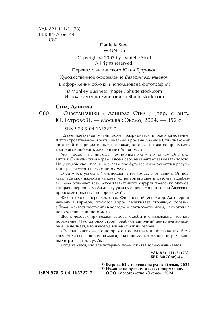 Даже идеальная жизнь может разрушиться в одно мгновение. В этом трогательном и эмоциональном романе Даниэла Стил знакомит читателей с харизматичными героями, которые пытаются преодолеть трагедию и победить жизненные обстоятельства. Лили Томас - начинающая чемпионка по лыжным гонкам. Она готовится к Олимпийским играм и всем сердцем мечтает завоевать золото. Но у судьбы свои планы, и счастливое будущее Лили рушится в результате трагического несчастного случая. Отец Лили, успешный бизнесмен Билл Томас, в отчаянии. Он возлагал все свои надежды на дочь, но теперь его мечты разбиты вдребезги. Билл обвиняет всех, даже талантливого хирурга Джессику Мэтьюз, которая оперировала Лили в ту ужасную ночь. Но и в жизни Джессики происходит опасный поворот судьбы. Жизни героев переплетаются. Финансовый менеджер Джо терпит неудачу в карьере, психолог Кэрол переживает страшную болезнь, а Тедди мечтает поступить в колледж и стать художником, несмотря на повреждение спинного мозга. Шесть человек принимают вызовы судьбы и отказываются терпеть поражение. И когда Билл строит реабилитационный центр для дочери, он еще не знает, что навсегда изменит жизни героев. "Счастливчики" - это история о том, как важно не сдаваться. Ведь когда Лили снова встает на лыжи, она понимает, что уже выиграла главные игры - игры судьбы. Когда кажется, что все потеряно, помни: битва только начинается.