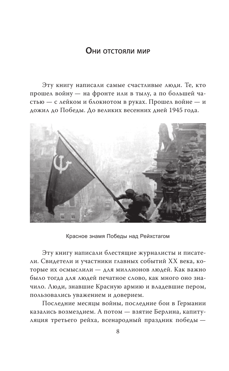 В этой книге впервые собраны лучшие репортажи о последних боях Второй Мировой войны. О боях в Германии и в Японии. О самых счастливых днях в истории нашей страны, когда, после четырех лет войны, пришла Победа. И о ней рассказали людям ярчайшие журналисты и писатели: Константин Симонов, Василий Гроссман, Юрий Герман, Владимир Брагин, Леонид Соловьев, Борис Полевой и многие другие военкоры Великой Отечественной. Талантливые и смелые люди, которые «на пикапе драном и с одним наганом первыми врывались в города». Они сохранили для нас правду о том, чем была победа для фронтовиков, для тех, кто пережил войну.