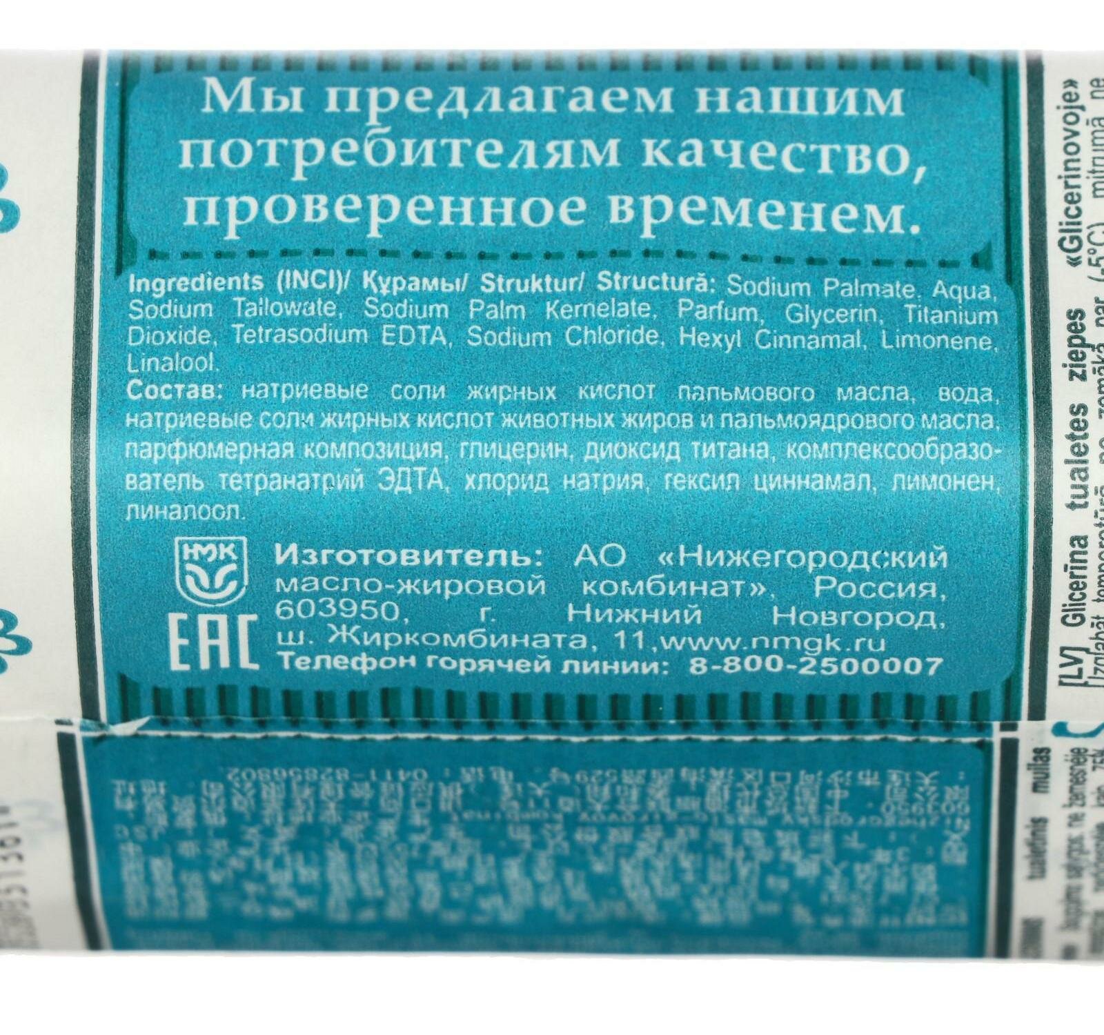 | Химический состав | Натриевые соли жирных кислот пальмового масла, вода, натриевые соли жирных кислот животных жиров и пальмоядрового масла, парфюмерная композиция, глицерин, диоксид титана, комплексообразователь тетранатрий эдта, хлорид натрия, лимонен, линалоол, гексил циннамал. |