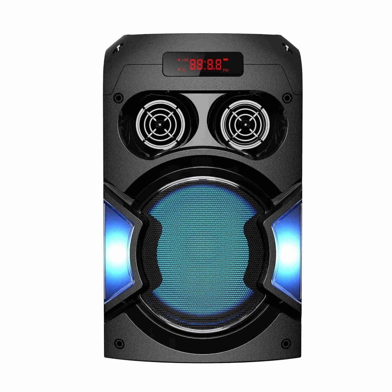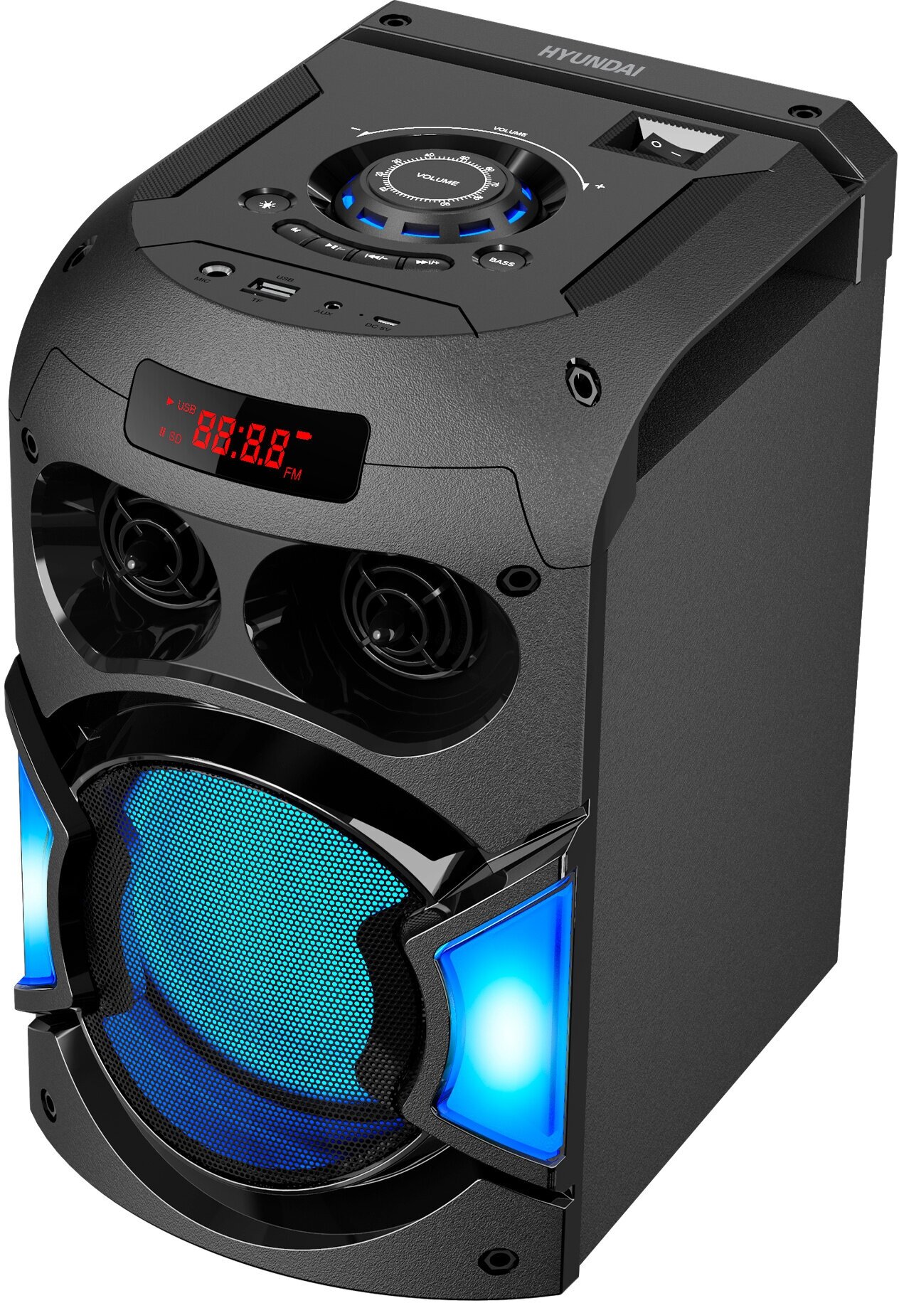 Портативный музыкальный центр Mini Hyundai представлен в корпусе с оригинальным дизайном и качественным 60-ти ваттным звучанием. Функционал акустической системы позволяет прослушивать музыкальные треки, подключая мобильные гаджеты, ПК, ТВ, флеш-носители и другие устройства через выходы AUX, USB, microSD и дистанционно, через соединение Bluetooth 5.0. Поддержка функции TWS обеспечивает присоединение одновременно до двух устройств, способствует усилению стереозвука. Предусмотрен доступ к FM-радио на частоте 87.5-108 МГц. Микрофонный вход позволяет использовать систему для караоке. Прибор габаритами 258х203х337 мм выполнен из гладкого ударопрочного пластика. Покрытый металлической сеткой динамик оснащен интегрированной RGB-подсветкой для светомузыки. Блок управления в верхней части корпуса позволяет переключать треки и радиостанции, управлять громкостью, регулировать режим подсветки. Здесь же расположены разъемы USB, слот для TF-карты, аудиовыход 3.5 мм, порт для микрофона 6.35 мм. LED-дисплей отображает текущие настройки. Кнопочный пульт позволяет дистанционно управлять устройством.