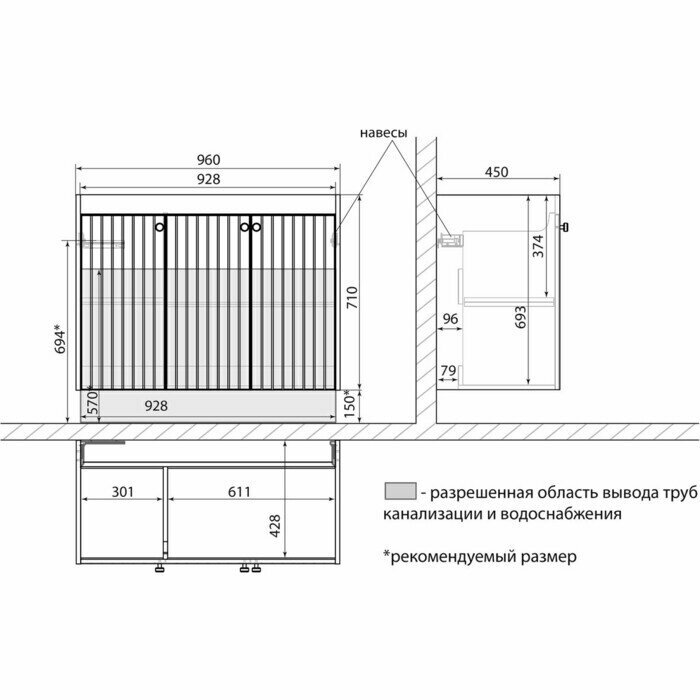 - Габариты корпуса тумбы (ШхВхГ): 960х710х450 мм.