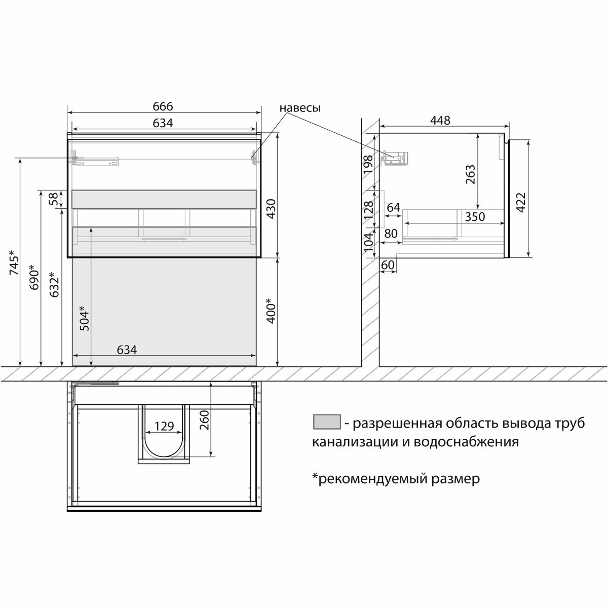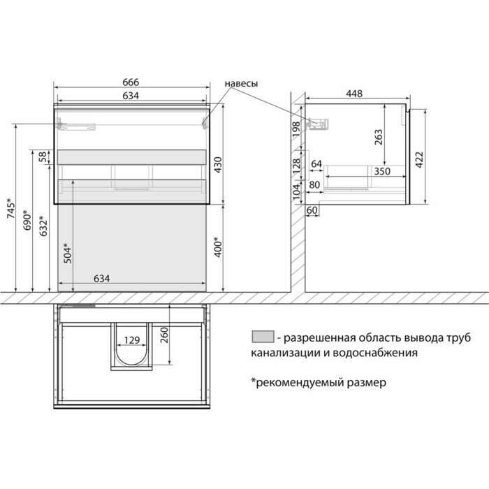 - Габариты корпуса тумбы (ШхВхГ): 666х430х448 мм.