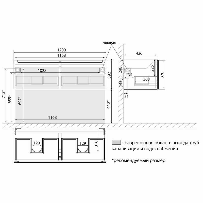 - Габариты корпуса тумбы (ШхВхГ): 1200х392х445 мм.