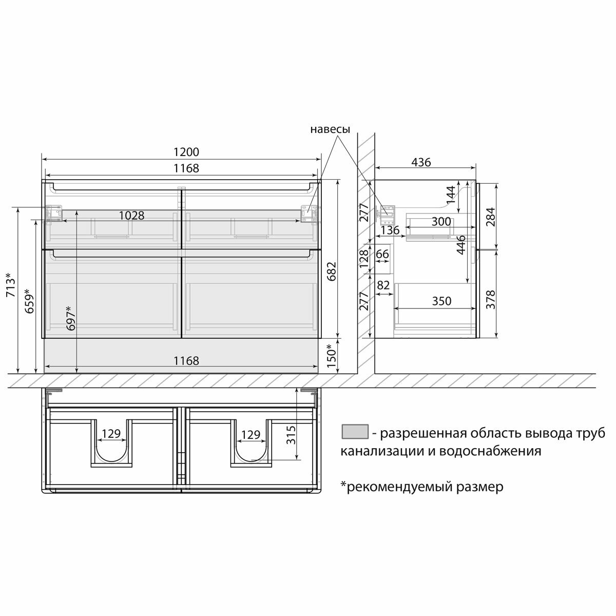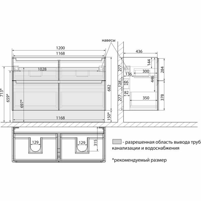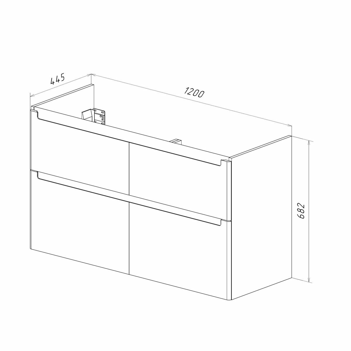 - Габариты корпуса тумбы (ШхВхГ): 1200х682х445 мм.