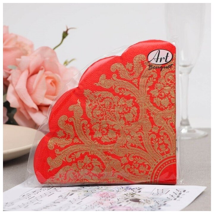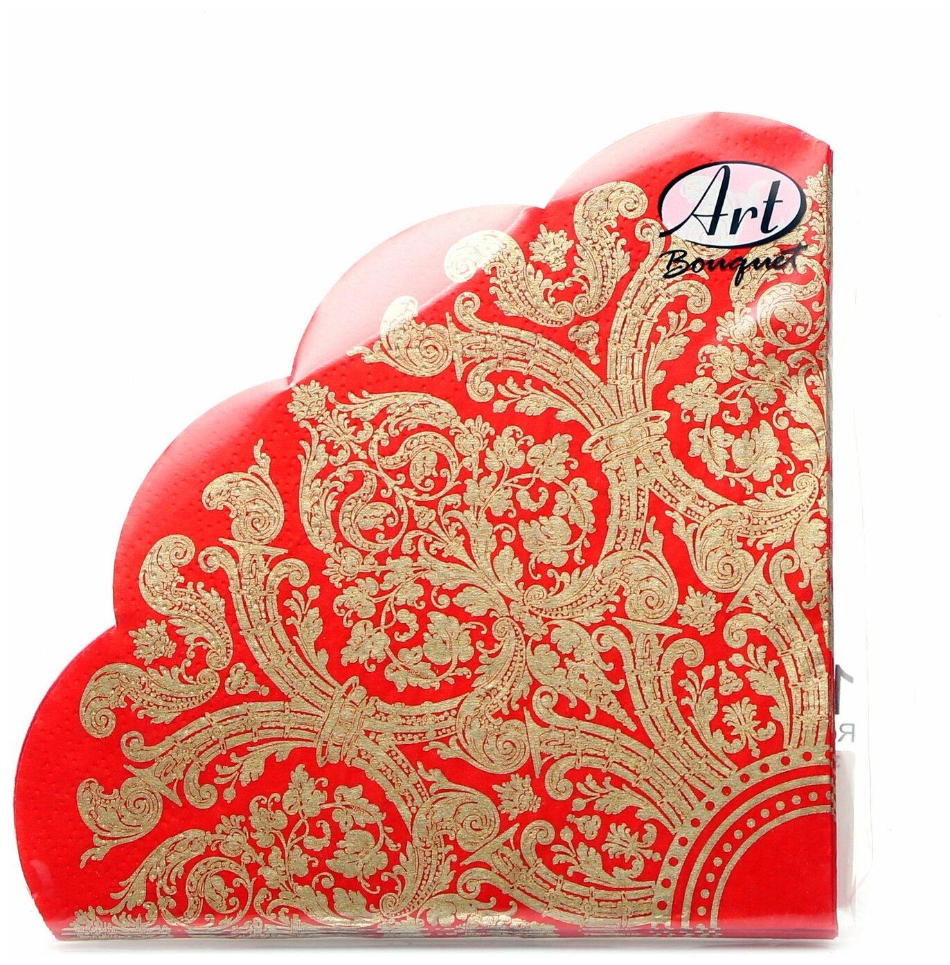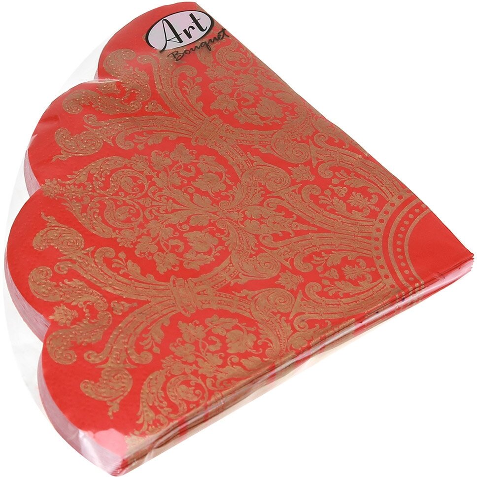 Салфетки одноразовые бумажные, трехслойные, круглые. Диаметр 32СМ. Упаковка 12шт. Тематический дизайн: Золотой орнамент на красном.