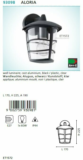 Светильник уличный Eglo Aloria 93098 черный 1 х 60 Вт
