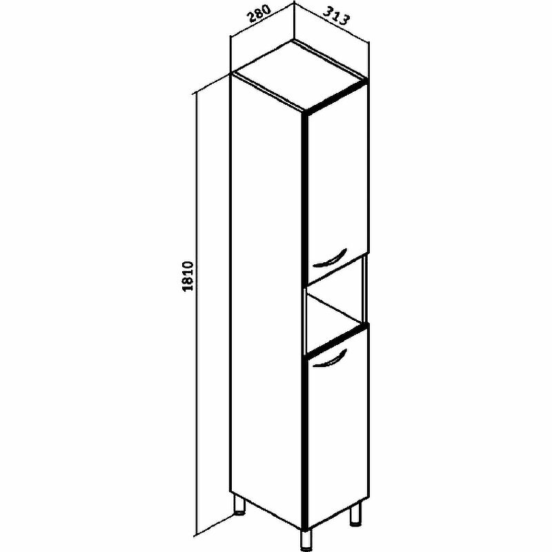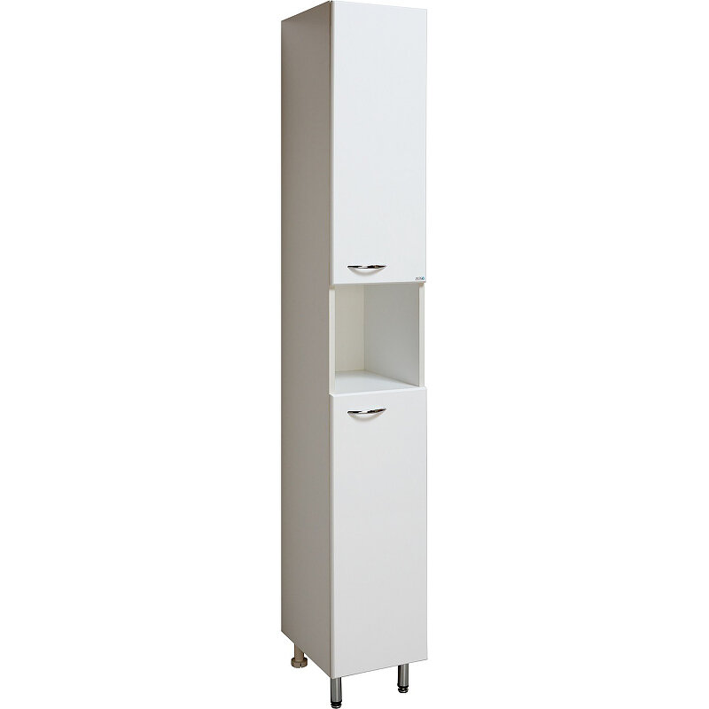 Шкаф-пенал RUNO – функциональное решение для современного оснащения ванной комнаты. Комплектующие качественно организуют систему хранения: петли со встроенным доводчиком, 2 ручки, 2 хромированные и 2 пластиковые ножки, 2 распашные дверцы, 2 встроенные полки в нижнем и верхнем отделениях и открытая ниша посередине.