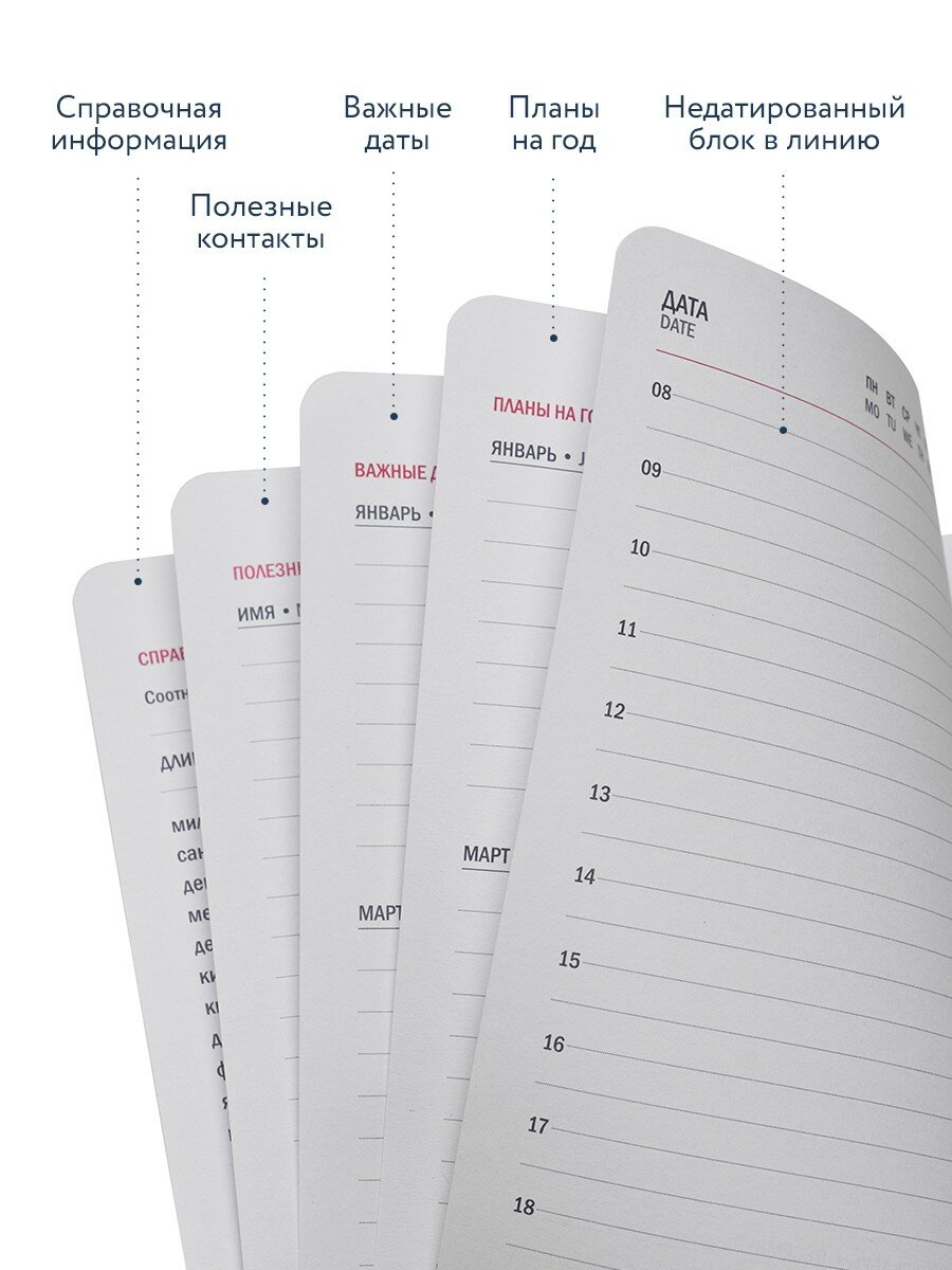 Ежедневник недатированный А5 (146х210мм), 144 листа, внутренний блок - белый офет 80 гр/м2, ниткошвейный, скругленные углы, печать в одну краску, линия. Обложка - твердый переплет, стык 2-х материалов, блинтовое тиснение. Одно ляссе. Индивидуальная ПЭТ упаковка.