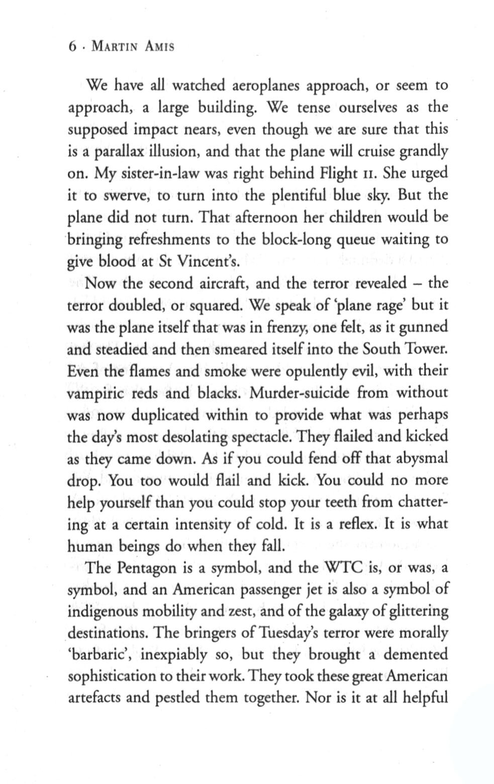 Martin Amis first wrote about September 11 a week later in a piece for The Guardian beginning, 'It was the advent of the second plane, sharking in low over the Statue of Liberty: that was the defining moment.'