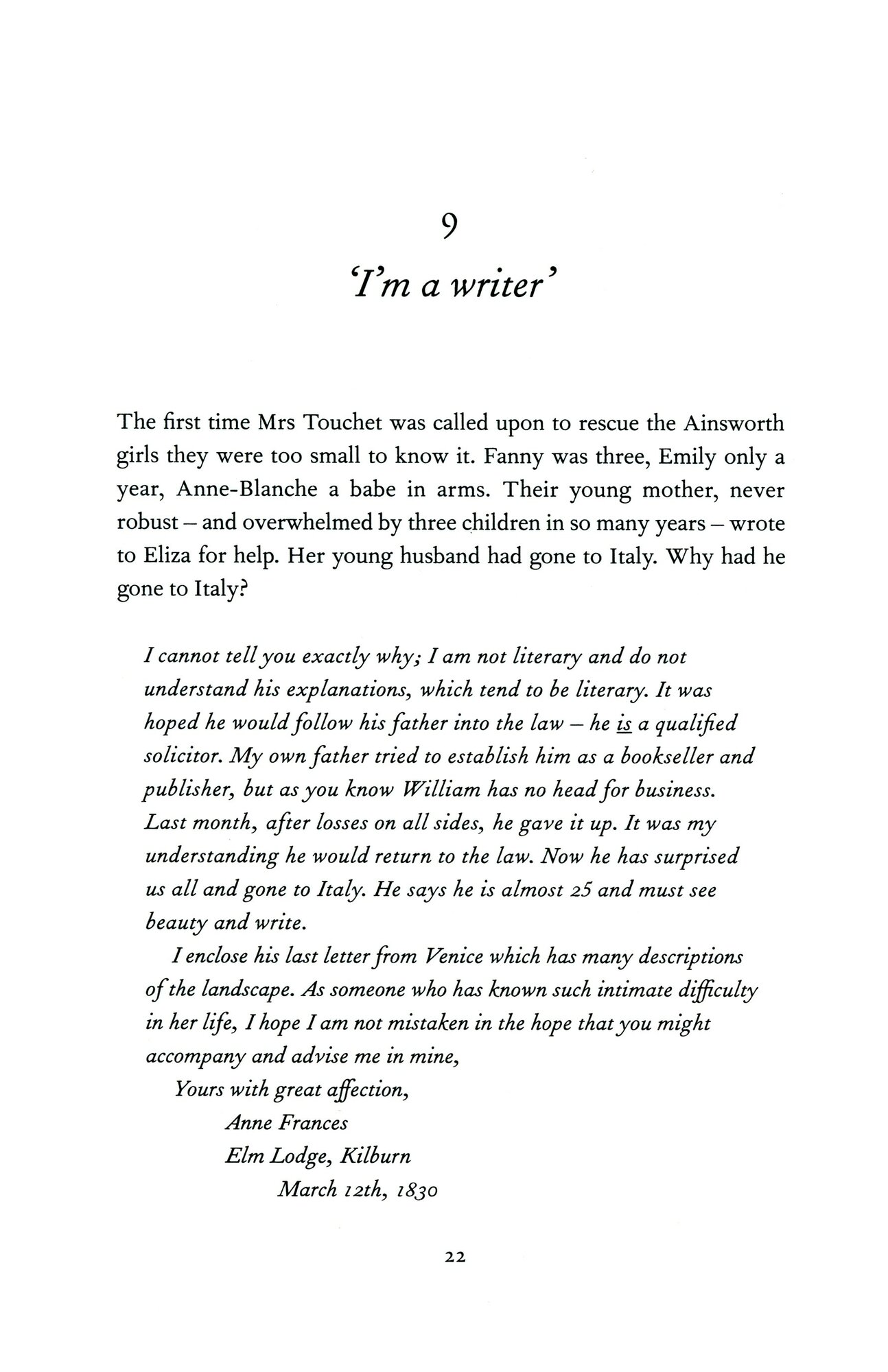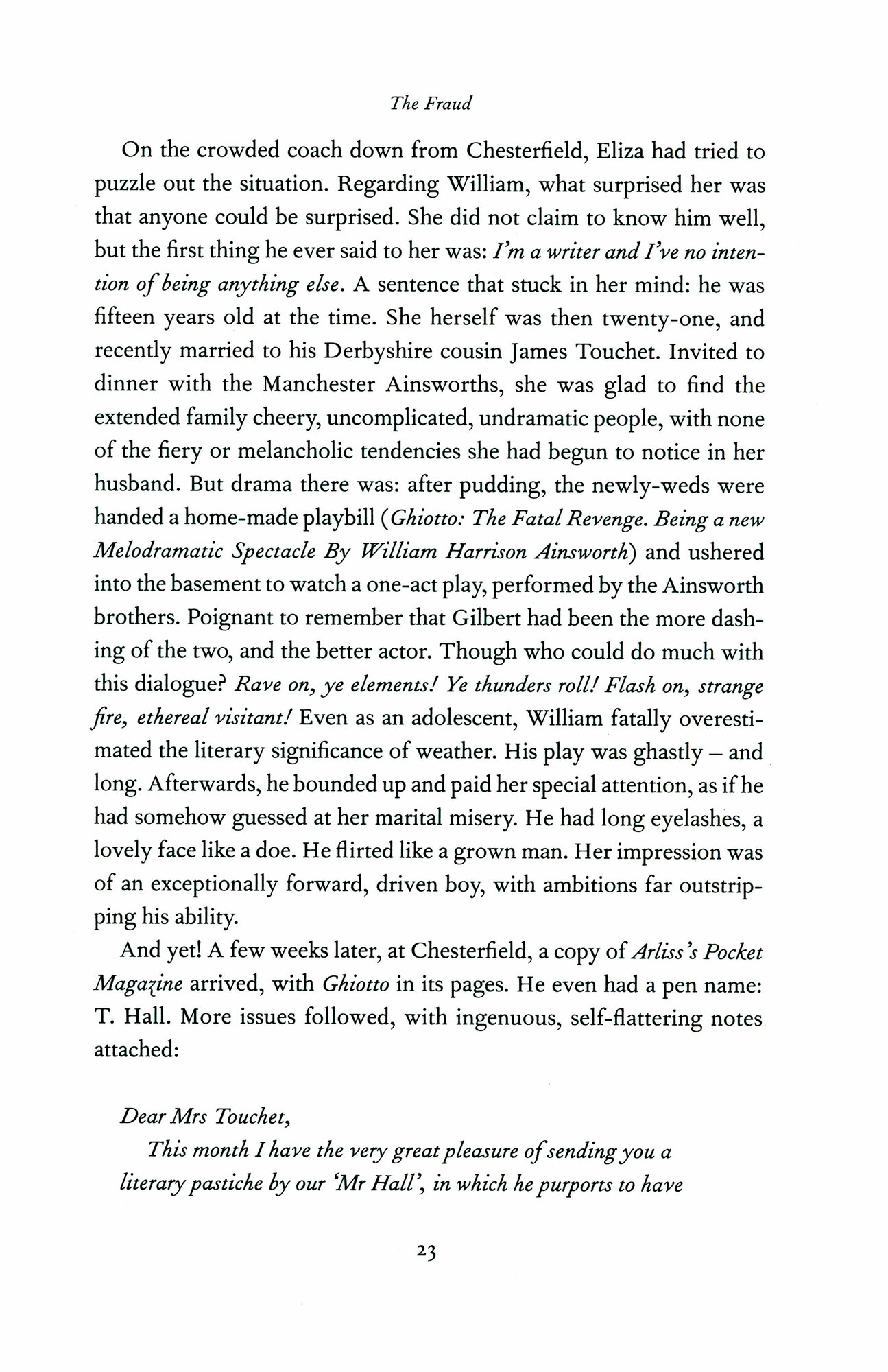 Mrs Touchet is a woman of many interests: literature, justice, abolitionism, class, her cousin, his wives, this life and the next. But she is also sceptical. She suspects her cousin of having no talent; his successful friend, Mr Charles Dickens, of being a bully and a moralist; and England of being a land of facades, in which nothing is quite what it seems.