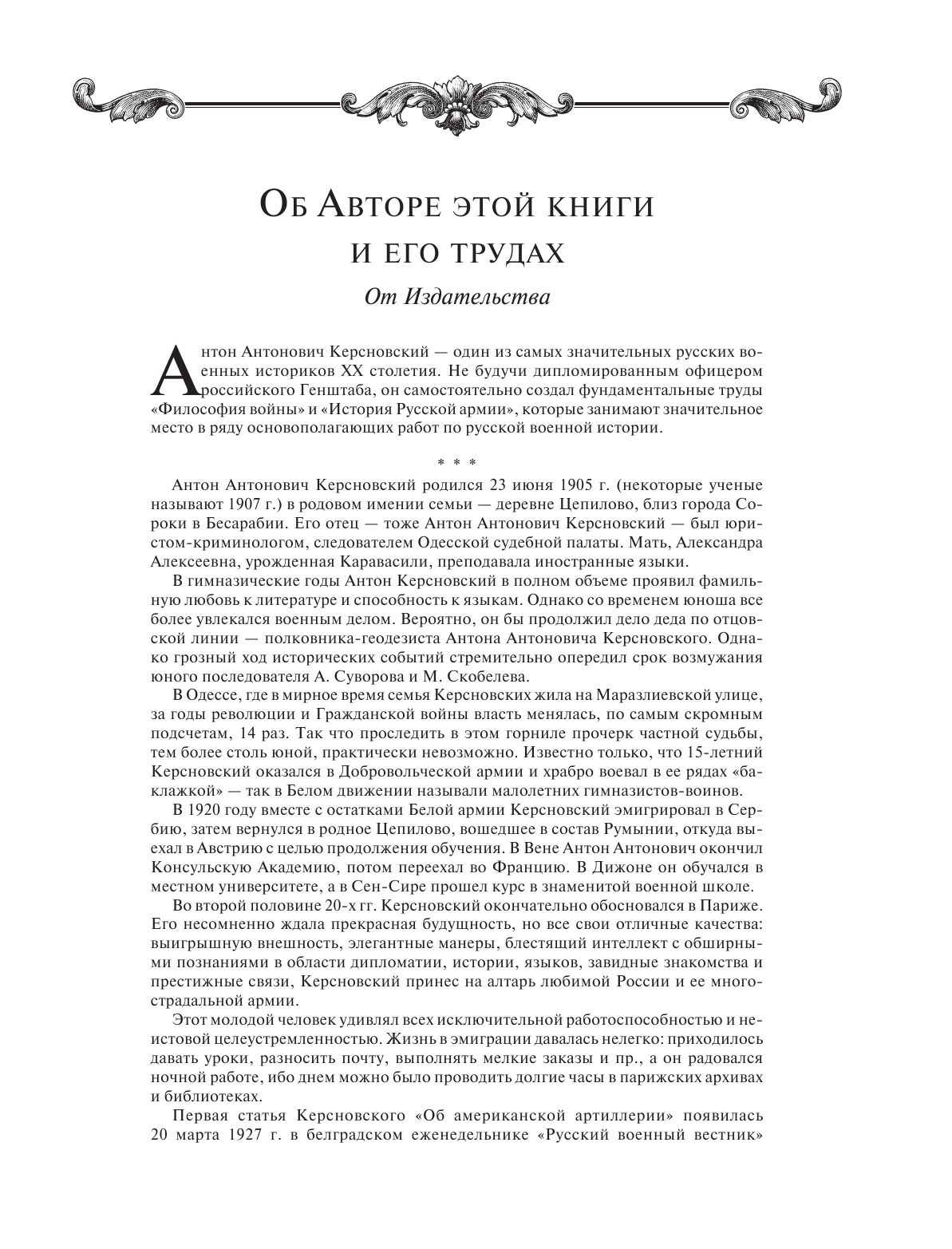 Антон Антонович Керсновский (1907—1944) по праву принадлежит к числу наиболее выдающихся военных историков XX века. Свой первый боевой опыт он получил в тринадцать лет на полях сражений Гражданской войны, но так и не стал ни полковником, ни генералом. Он всем сердцем болел за Россию, но скончался в Париже в разгар Второй мировой войны, которую предсказал задолго до ее фактического начала. Еще при жизни А. А. Керсновского его работы по военному делу высоко оценивались современниками, а по прошествии века укрепились в ряду классических трудов по русской военной истории.