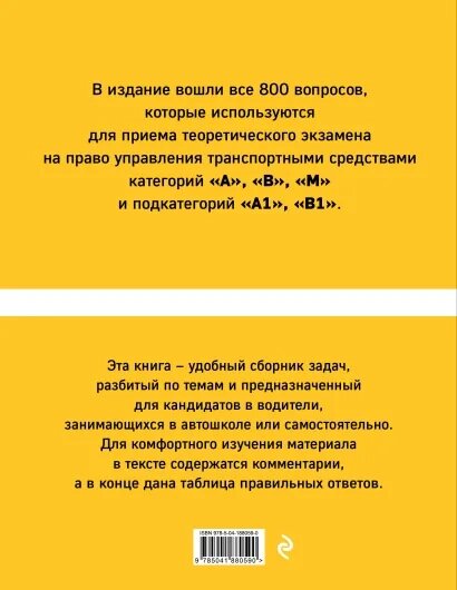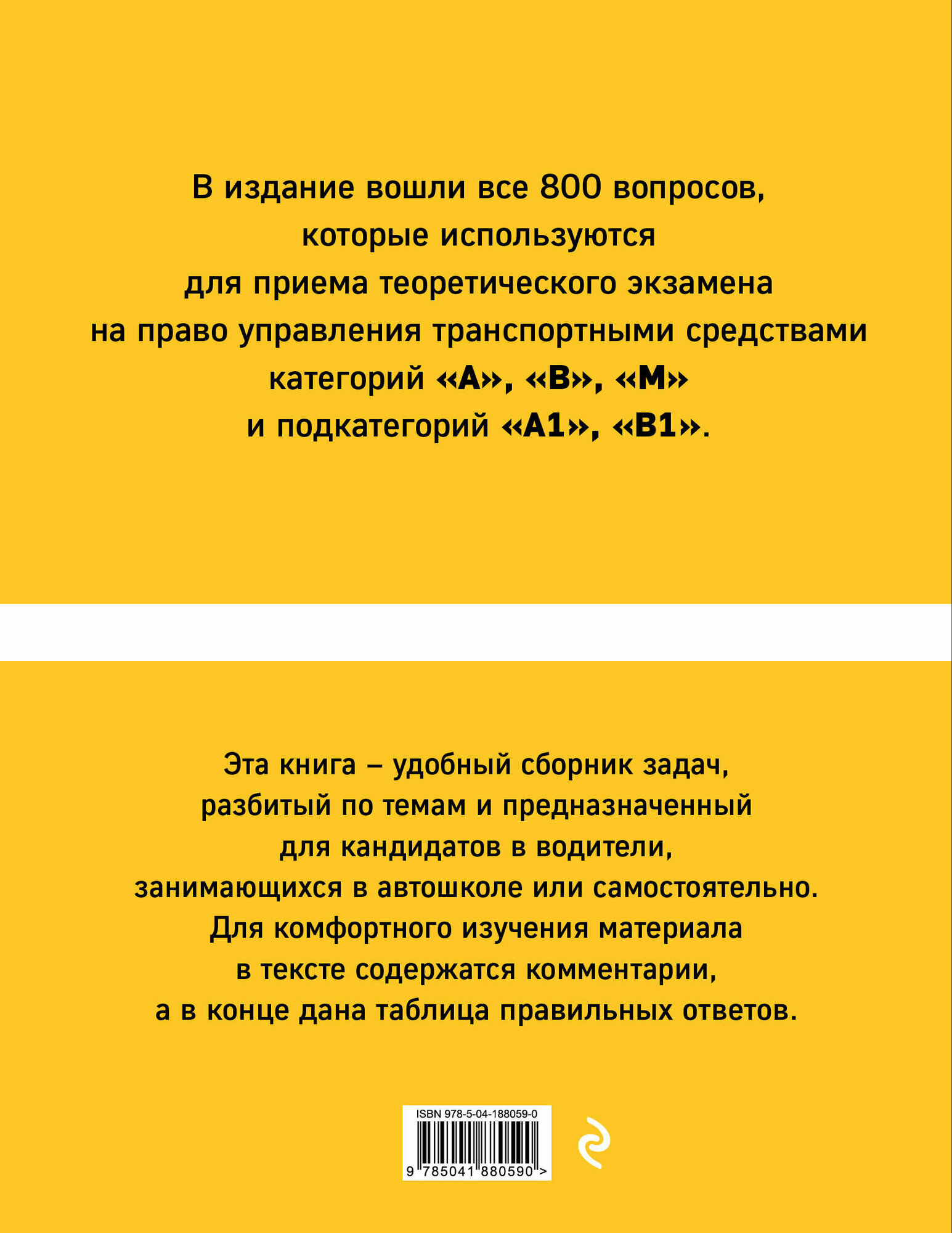 В издание вошли все 800 вопросов, которые используются для приема теоретического экзамена на право управления транспортными средствами категории «А», «В», «М» и подкатегорий «А1», «В1».