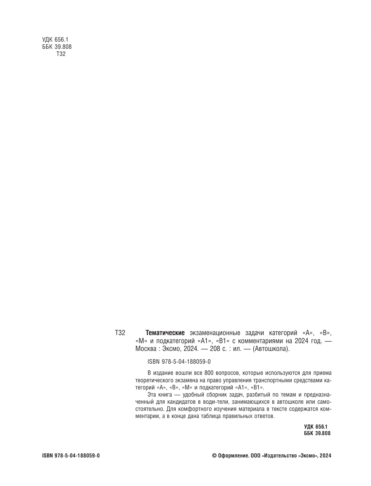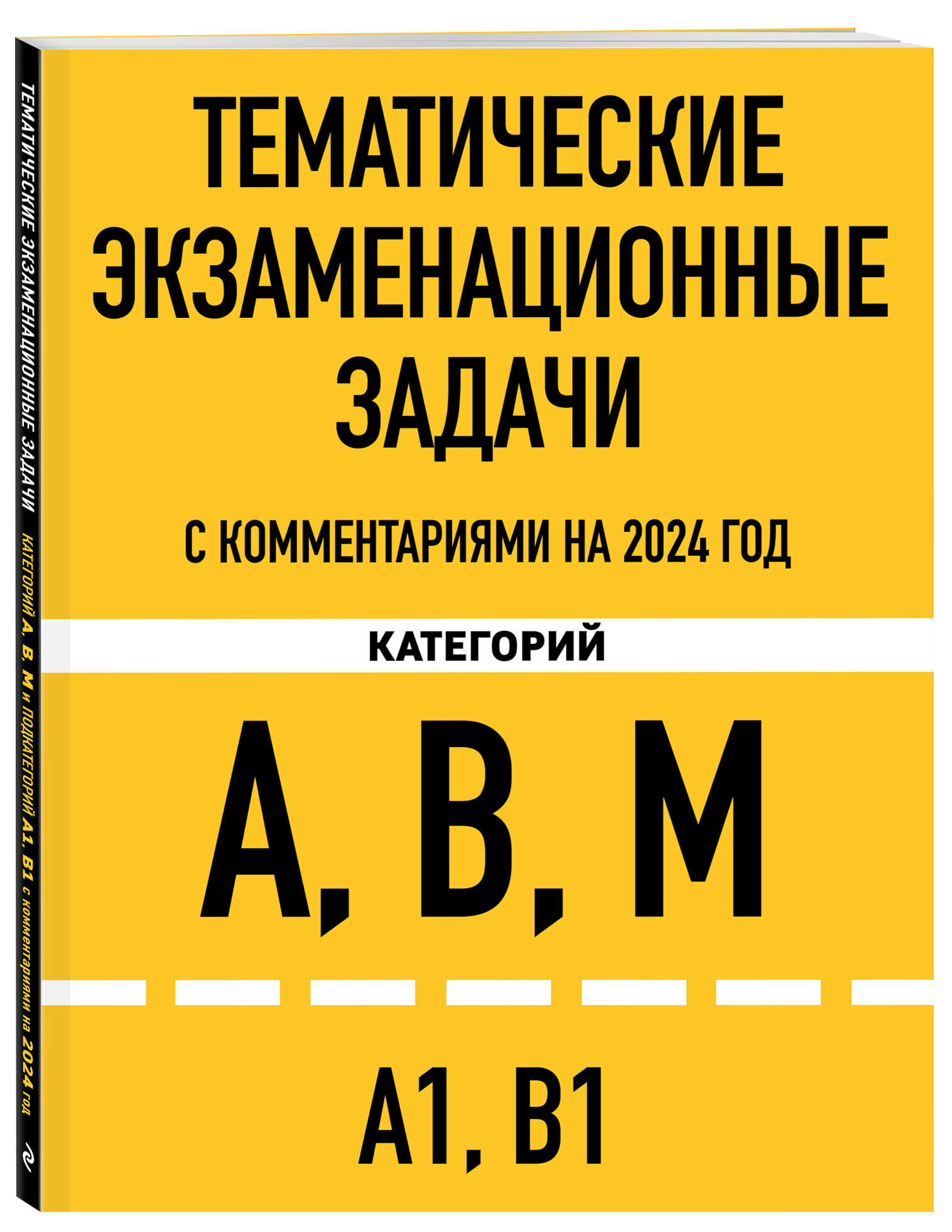Тематические экзаменационные задачи категорий "А" "В" "М" и подкатегорий "А1" "В1" с комментариями на 2024 год (Волнухина Д. (ред.)); ООО "Издательство "Эксмо", 2023