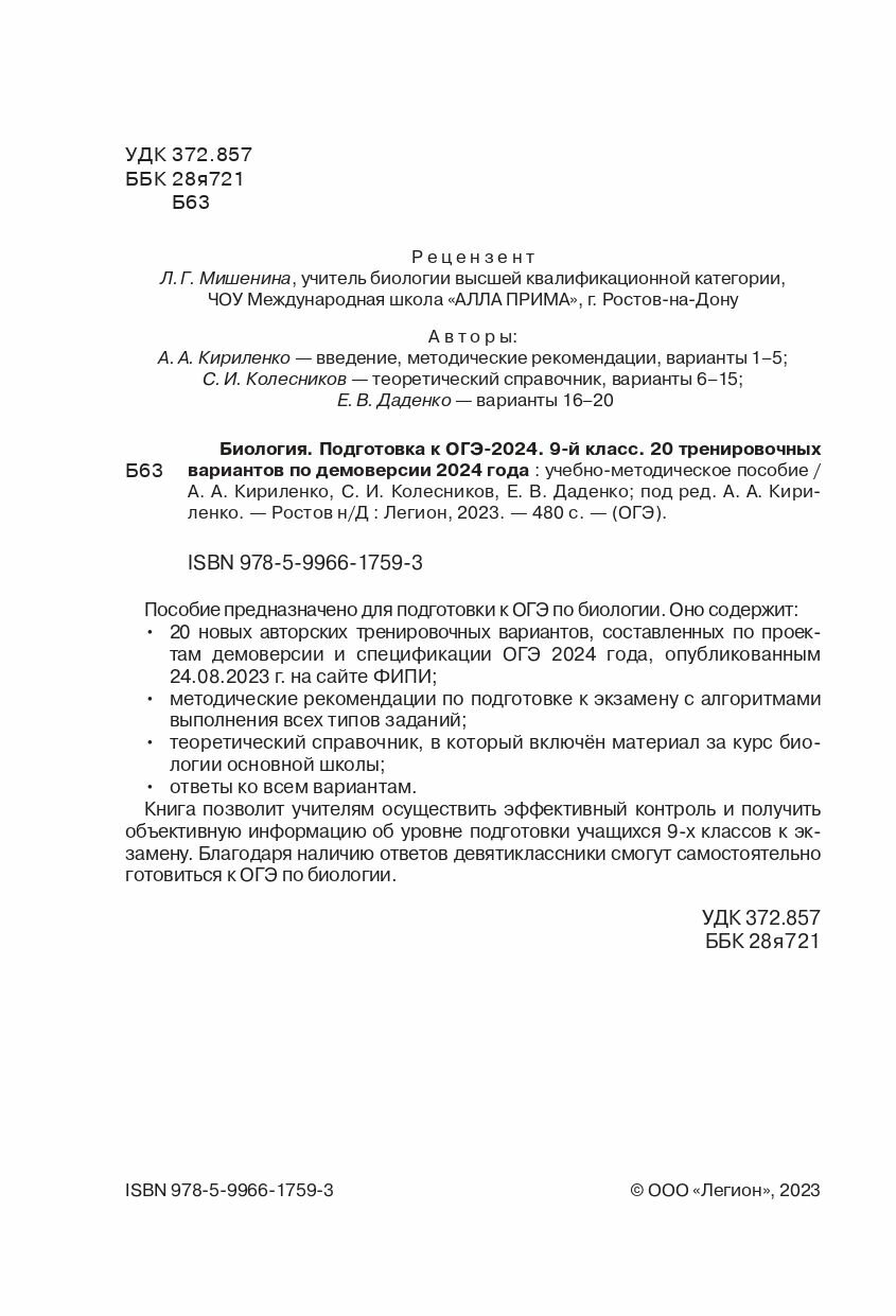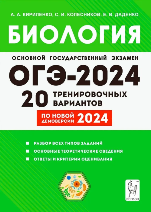 Биология. Подготовка к ОГЭ-2024. 9-й класс. 20 тренировочных вариантов по демоверсии 2024 года (Колесников Сергей Ильич, Кириленко Анастасия Анатольевна, Даденко Евгения Валерьевна); Легион, 2023