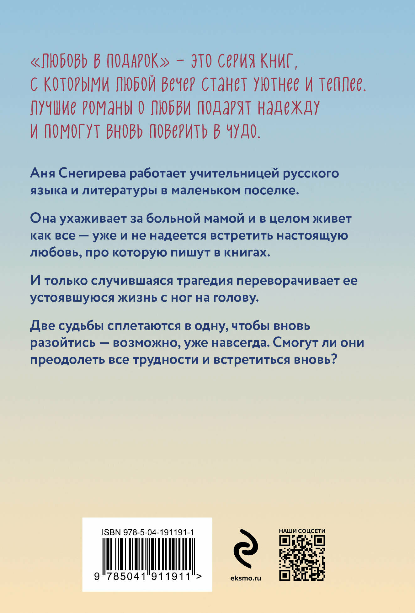 Аня Снегирева работает учительницей русского языка и литературы в маленьком поселке. Она ухаживает за больной мамой и в целом живет как все — уже и не надеется встретить настоящую любовь, про которую пишут в книгах. И только случившаяся трагедия переворачивает ее устоявшуюся жизнь с ног на голову. Две судьбы сплетаются в одну, чтобы вновь разойтись — возможно, уже навсегда. Смогут ли они преодолеть все трудности и встретиться вновь?