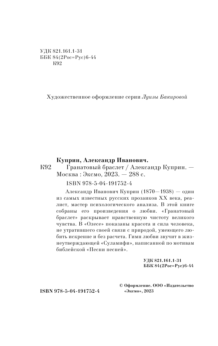 Книга: Гранатовый браслет (Александр Куприн); Эксмо, Редакция 1, 2025