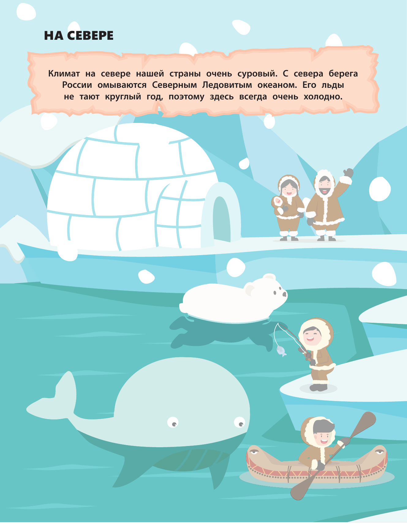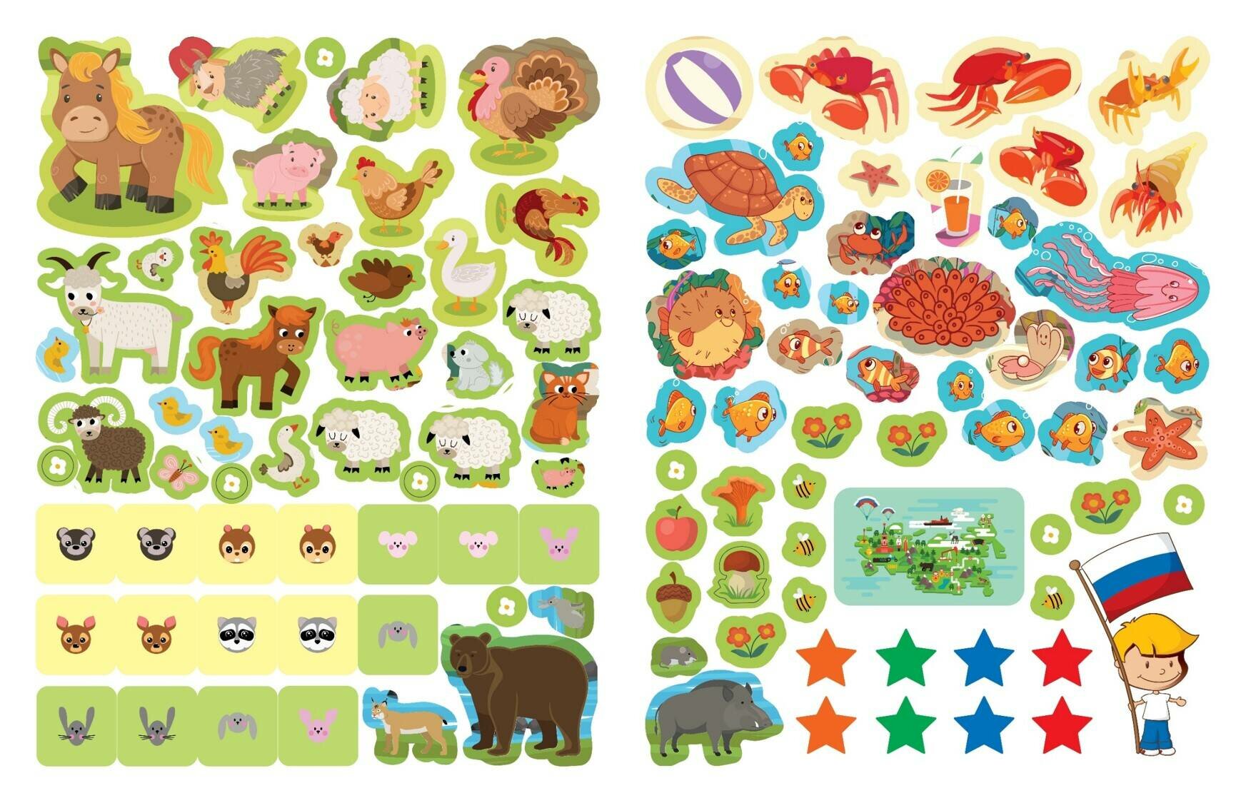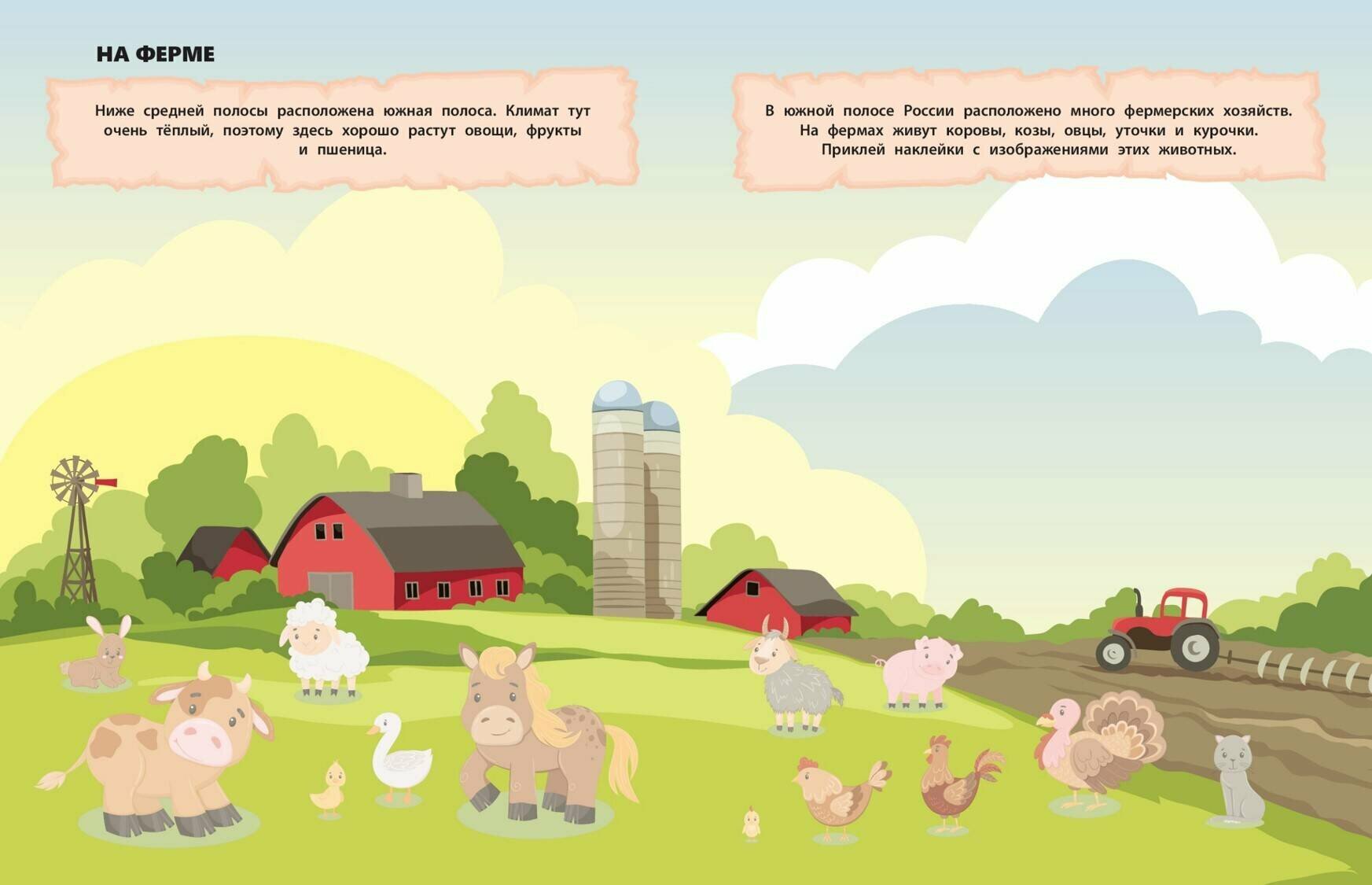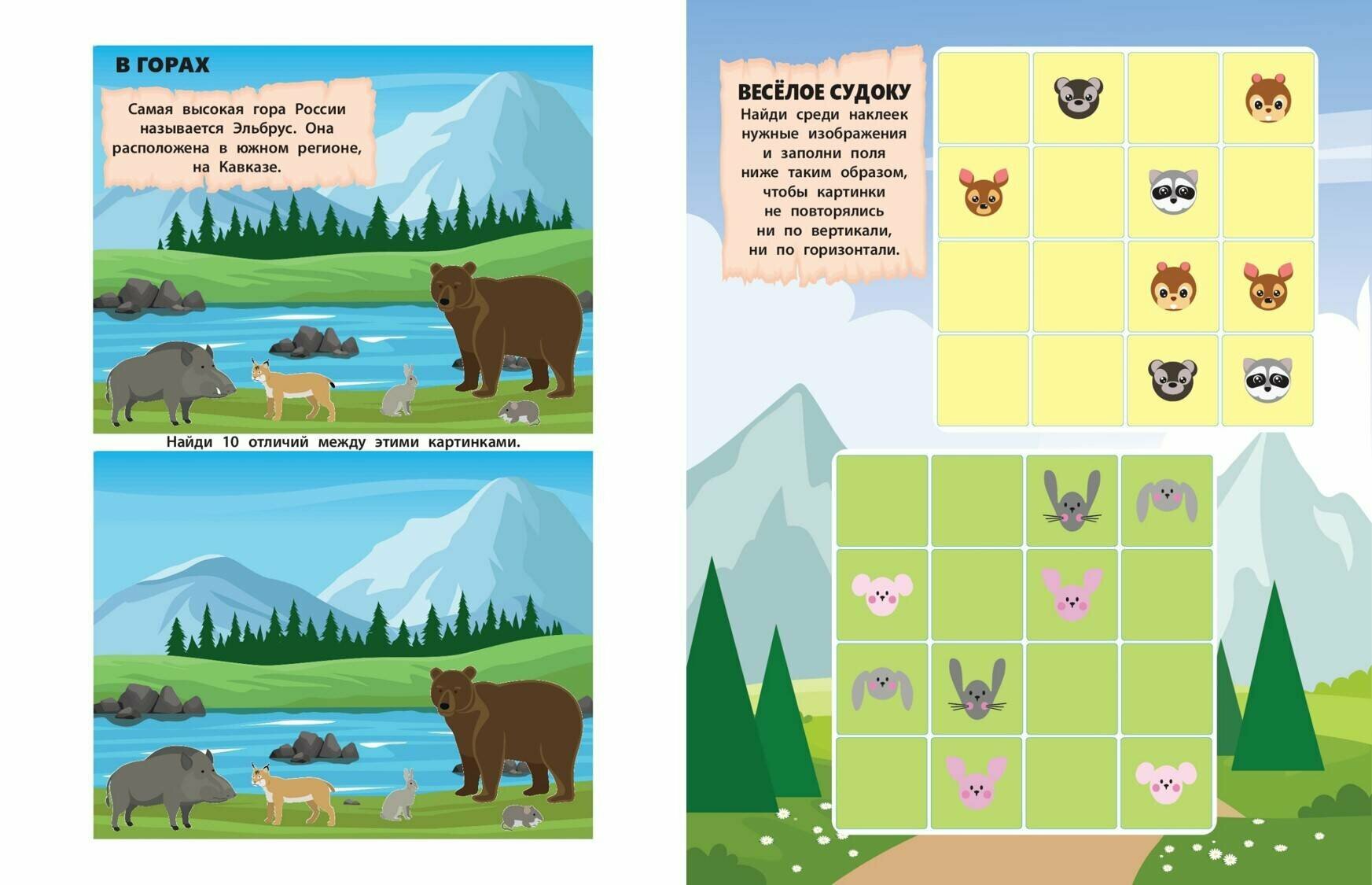Отправляйся в путешествие по самой большой и самой удивительной стране в мире — по нашей России. Ты узнаешь, какие животные живут на севере нашей Родины, прогуляешься по лесу средней полосы, заглянешь на ферму и проведаешь забавных зверушек, съездишь в отпуск на самое тёплое море России, а ещё сможешь весело провести время с коллекцией ярких наклеек!
