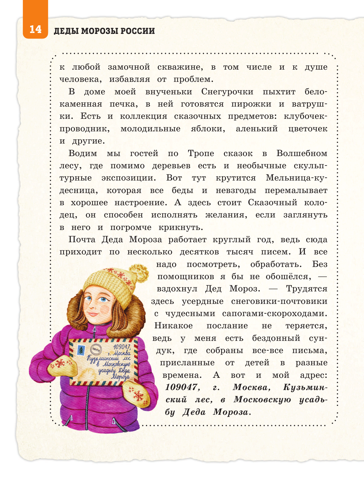 Книга «Деды Морозы России» богато иллюстрирована художницей Натальей Федоровой. На каждой странице можно найти красочные рисунки и достопримечательности, а тщательно подобранные фотографии отлично дополняют повествование.