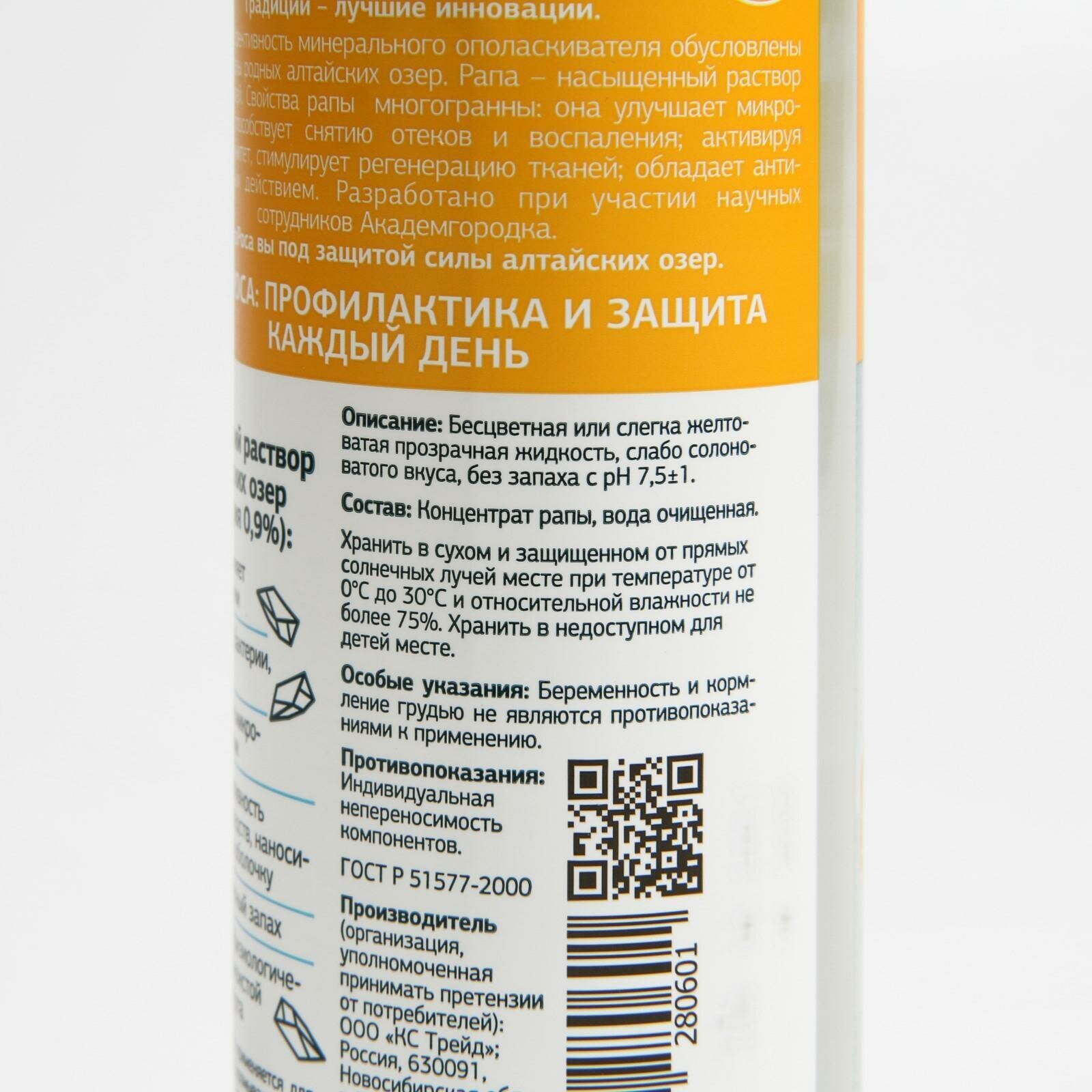 | Состав | Концентрат рапы, вода очищенная. Рапа — это озерная соль, природный минерально — солевой комплекс, образующийся в экологически чистых соленых озерах Алтайского края. Эффективность рапы доказана. Содержит 17 минералов и биологически активных компонентов (Основные минералы |