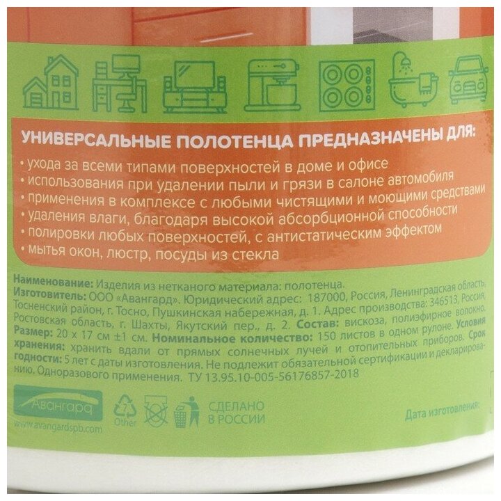 Салфетки универсальные хозяйственные для уборки в рулоне. Количество 150 шт. Размер 20 х 17 см. Тряпочки и салфетки для уборки в рулоне очень удобны для использования на кухне, в доме, в автомобиле, в ванной, в офис. Легко отрываются. Высокое содержание вискозы обеспечивает хорошую способность впитывать влагу и легко собирать загрязнения. Добавление полиэстера придает прочность и долговечность салфетке. Можно использовать влажной и сухой, с моющими средствами или без них. Подходят для повседневной уборки, в качестве кухонных полотенец, для мытья окон и зеркал. Универсальные полотенца предназначены для: Уход за всеми типами поверхностей в доме и офисе. Использование универсальной салфетки при удалении пыли и грязи в салоне автомобиля. Салфетки для кухне в рулоне применяется в комплексе с любыми чистящими и моющими средствами Кухонные салфетки рулон удаляет влагу, благодаря высокой абсорбционной способности Тряпка половая микрофибра для полировки любых поверхностей, с антистатическим эффектом Инвентарь для уборки