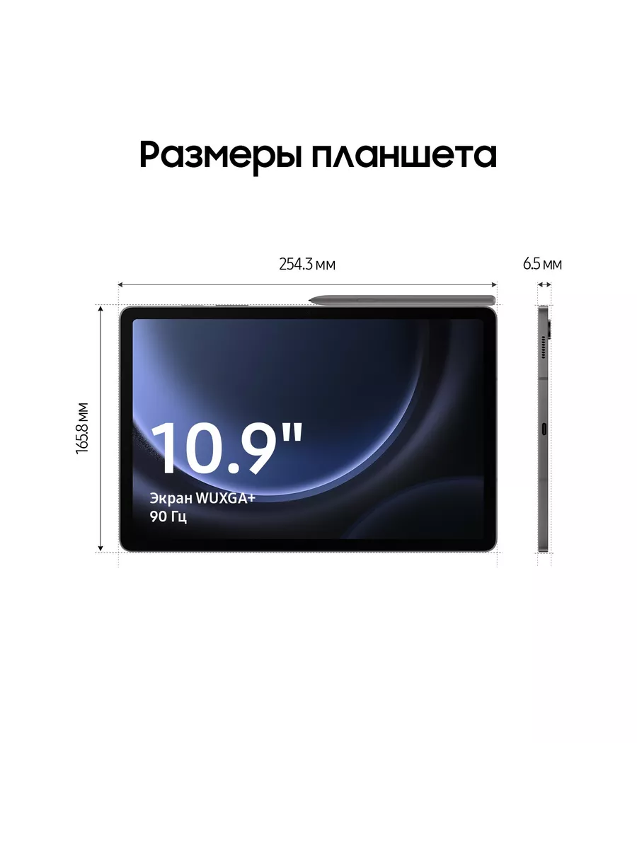 С производительным планшетным компьютером Samsung Galaxy Tab S9 FE легко и удобно работать, учиться, развлекаться и общаться. Компактная модель не займет много места в багаже во время путешествий. Работать целый день без подключения к розетке позволяет энергоемкий аккумулятор. Планшет с 11-дюймовым экраном, шустрым процессором и стилусом в комплекте станет надежным помощником для решения повседневных задач.Galaxy Tab S9 FE выполнен в современном минималистичном дизайне. Он получил прочный и легкий алюминиевый корпус с влагозащитой по стандарту IP68. Устройство не боится капель влаги и погружения в пресную воду на глубину до 1.5 м на срок до 30 минут. Модель 6.5 мм толщиной имеет габариты 254.3х165.8 мм при весе 524 г. Гаджет легко поместится в сумку и рюкзак, его удобно нести в руке.Модель получила яркий WUXGA+ экран с разрешением 2304х1140 пикселей с диагональю 10.9 дюймов. Он воспроизводит четкое и реалистичное изображение отличного качества. Благодаря тонким рамкам вы сможете погрузиться в контент с первых минут. Частоты обновления 90 Гц достаточно для плавного скроллинга и просмотра динамичных видео без рывков и задержек.Планшет оснащен парой стереодинамиков компании AKG. Они позволяют наслаждаться отличным звучанием любимых треков и реалистичными спецэффектами в фильмах.Galaxy Tab S9 FE поможет быстро и эффективно решать повседневные задачи. С помощью комплектного стилуса S Pen удобно делать заметки, наброски, работать с изображениями, текстовыми документами и таблицами. Быстрый и выносливый процессор Exynos 1380 при поддержке 6 ГБ оперативной памяти обеспечивает отличное быстродействие. В емком внутреннем хранилище на 128 ГБ поместится большое количество фото, видео и других пользовательских файлов. Аккумулятор увеличенной емкости 8 000 мАч с поддержкой быстрой зарядки 45 Вт поможет всегда оставаться на связи.