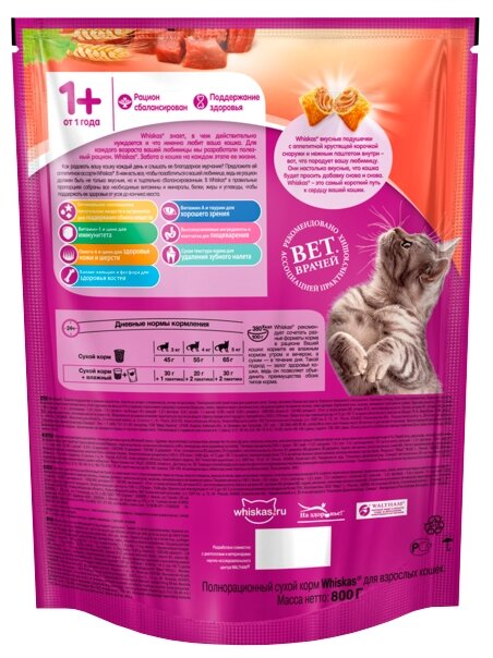 Это сбалансированный рацион для здоровой и счастливой жизни Вашей кошки. Хрустящие подушечки с нежным паштетом внутри обязательно придутся по вкусу Вашей любимице. Кроме того, Whiskas содержит все необходимое, чтобы еда Вашей кошки была не только вкусной, но и полезной.