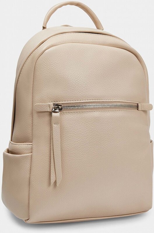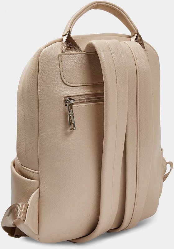 Рюкзак женский городской из экокожи. Общее вместительное отделение закрывается на молнию, внутри и снаружи есть три кармана для денег и документов. Открытые боковые карманы удобны для мелочей. Две широкие лямки регулируются по длине, благодаря мягкому наполнителю они не будут давить на плечи. Есть короткая ручка для ношения в руках. Рюкзак женский бежевый дополнит нестрогие рабочие и повседневные casual образы.