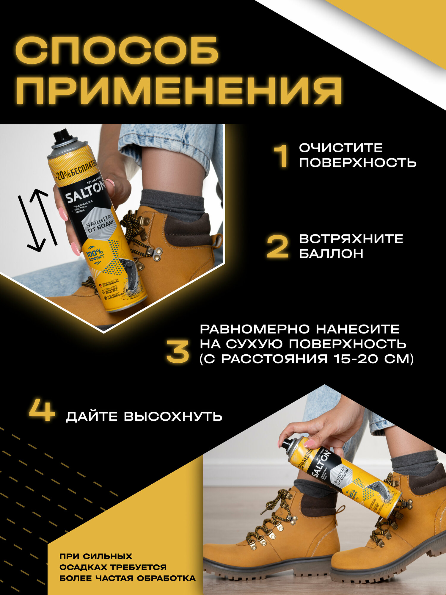 Salton водоотталкивающая пропитка для обуви в новом семейном формате 400 мл - это высокоэффективная формула с использованием компонентов из Германии. Она поможет надежно защитить обувь и одежду всей семьи на весь сезон! Можно не беспокоиться о дождливых днях или грязных дорогах - наша уникальная пропитка создает невидимый барьер, способный справиться с самыми суровыми испытаниями. Даже когда другая обувь станет мокрой и грязной, ваша обувь, защищенная нашей пропиткой, будет выглядеть идеально! Что делает пропитку Salton наиболее эффективной? Универсальное средство для обуви и одежды обладает мощным водоотталкивающим эффектом благодаря высокому содержанию фторкарбоновых смол. Фторкарбон создает защитный слой на поверхности – влага не проникает внутрь материала, а собирается на поверхности в капли и стекает. Спрей Salton надежно защищает обувь и одежду от влаги, грязи и снега, сохраняя дышащие свойства обрабатываемых материалов. Средство для защиты от воды для обуви и одежды Salton предназначено для обработки изделий из гладкой кожи, замши, нубука, а также мембранных материалов. Бесцветный аэрозольный спрей легко наносится, быстро впитывается и не оставляет следов на обуви. После обработки рекомендуется подождать 1-5 часов для наилучшего результата Забудьте о неудобных и неэффективных пропитках, которые подводят в самый неподходящий момент! Наш продукт освободит вас от забот о сохранности обуви, предоставив вам уверенность и свободу на каждом шаге! SALTON -ТРИУМФ ИННОВАЦИЙ НАД ПОГОДОЙ!