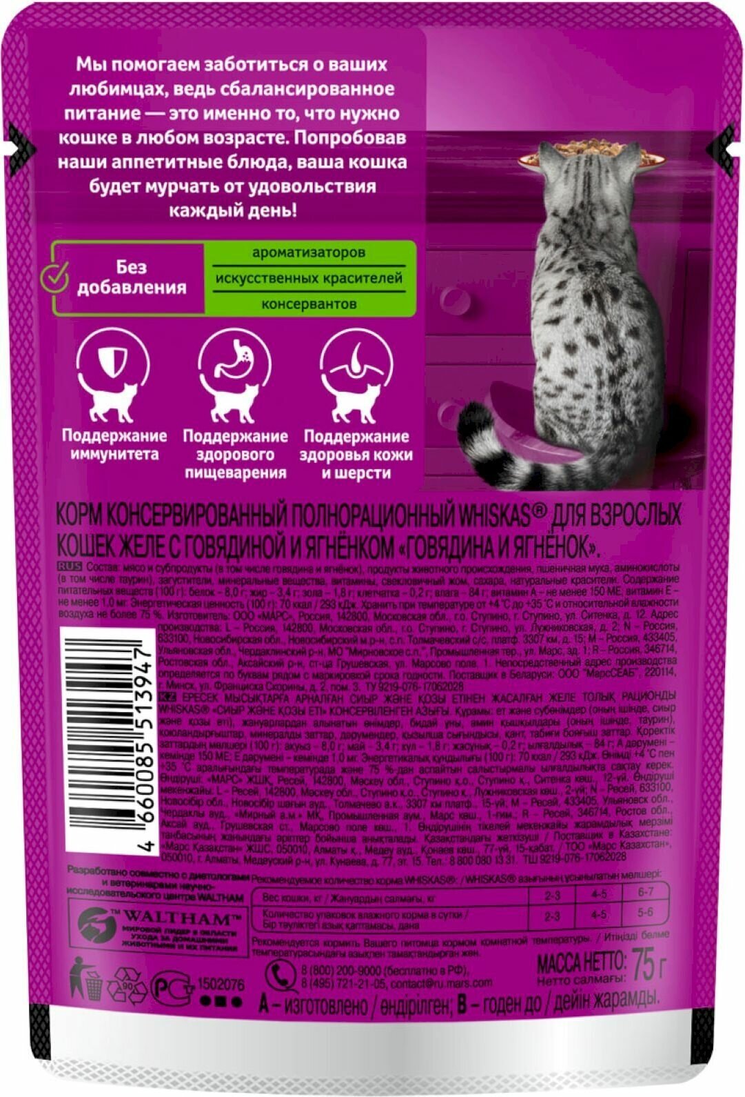 Это сбалансированный рацион, приготовленный именно так, как любит Ваша кошка. Аппетитное рагу с говядиной и ягненком в густом ароматном соусе подарит Вашей любимице настоящее удовольствие. Кроме того, Whiskas® содержит все необходимое, чтобы еда Вашей кошки была не только вкусной, но и полезной. Whiskas® для взрослых кошек это: