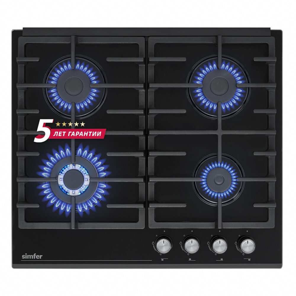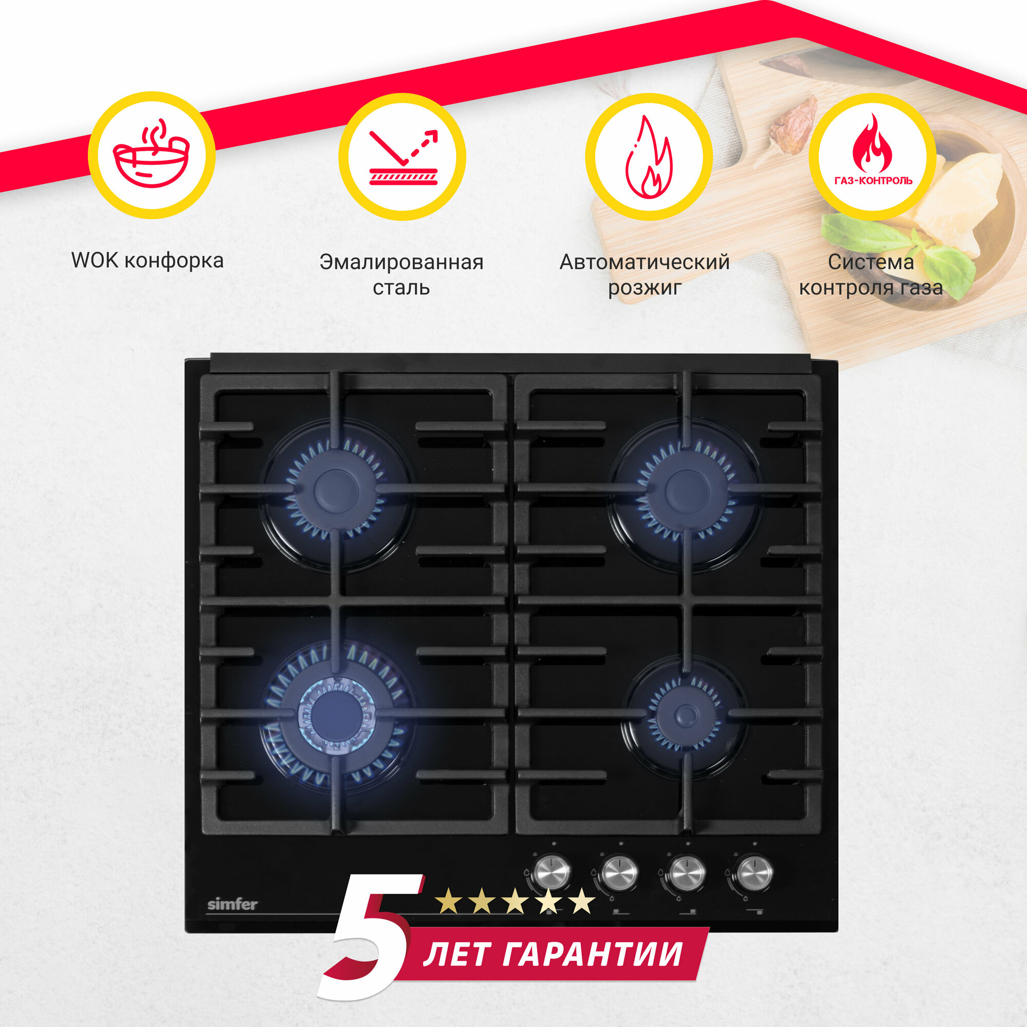 Газовая варочная поверхность Simfer H60H41S570 (газ-контроль WOK конфорка чугунные решетки черное стекло)