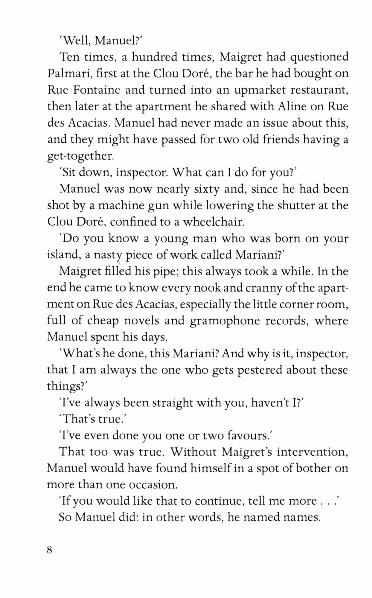Maigret finds himself back on the Rue des Acacias just ten days after cracking another case there. This time it is the murder of a criminal Maigret has known for over twenty years and one he always suspected was behind a string of jewellery robberies in the city. Maigret's patience is tested as he eliminates neighbour by neighbour in his hunt for the murderer.