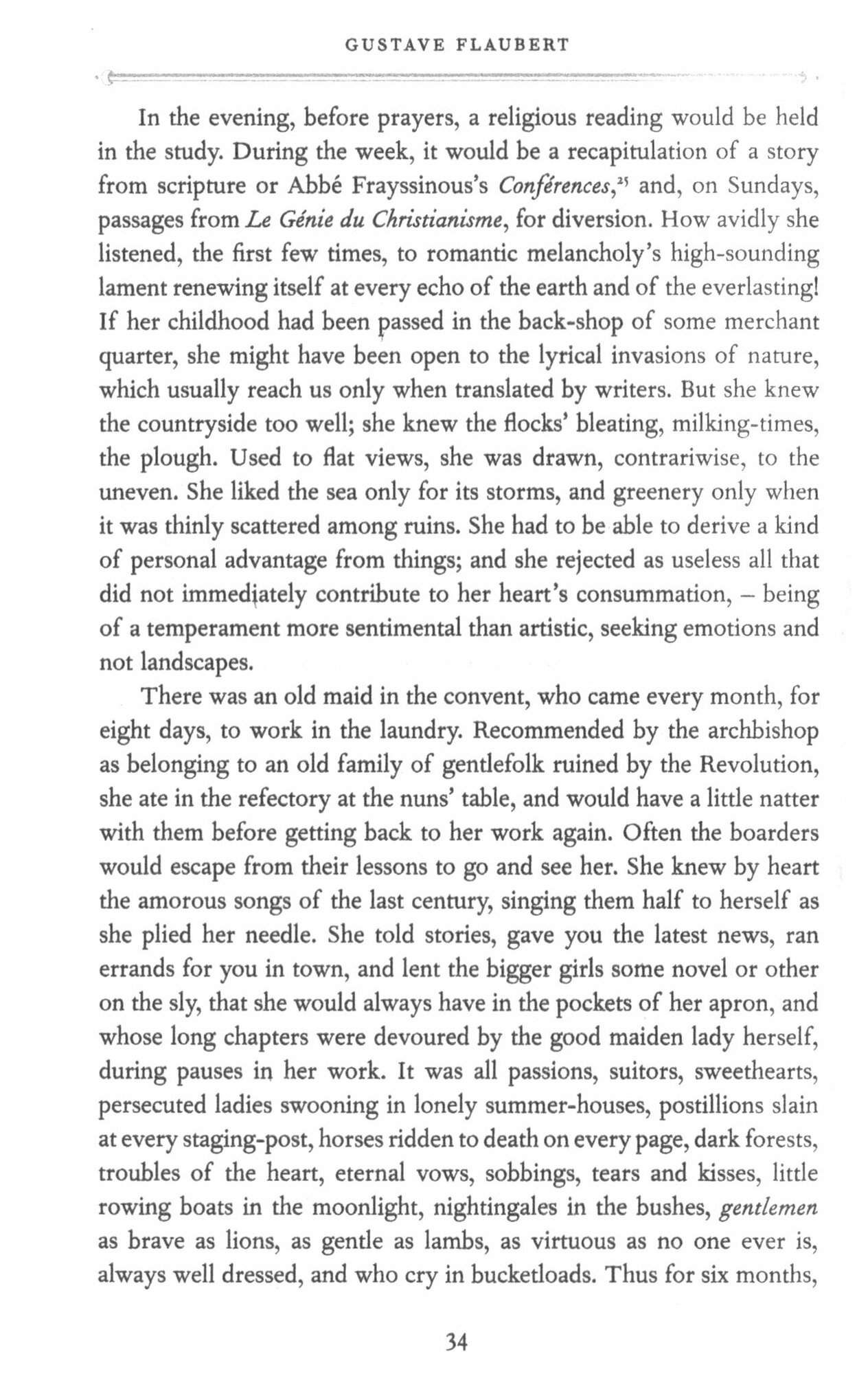 Emma Bovary is an avid reader of sentimental novels; brought up on a Normandy farm and convent-educated, she longs for romance. At first, Emma pins her hopes on marriage, but life with her well-meaning husband in the provinces leaves her bored and dissatisfied. She seeks escape through extravagant spending sprees and, eventually, adultery. As Emma pursues her impossible reverie she seals her own ruin.