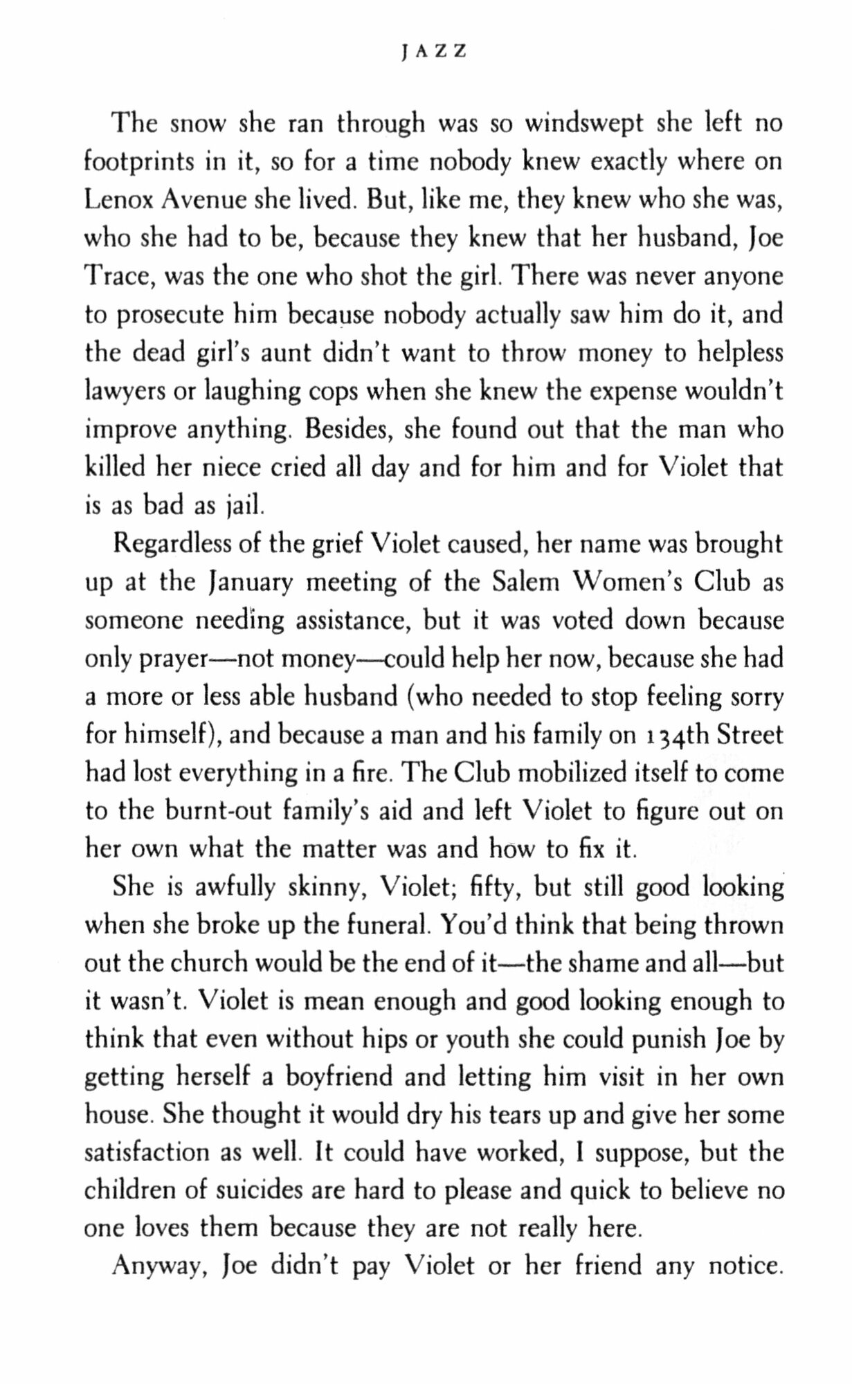 At the funeral, his determined, hard-working wife, Violet, who is given to stumbling into dark mental cracks, tries with a knife to disfigure the corpse. Passionate and profound, Jazz brings us back and forth in time, in a narrative assembled from the hopes, fears and realities of black urban life.