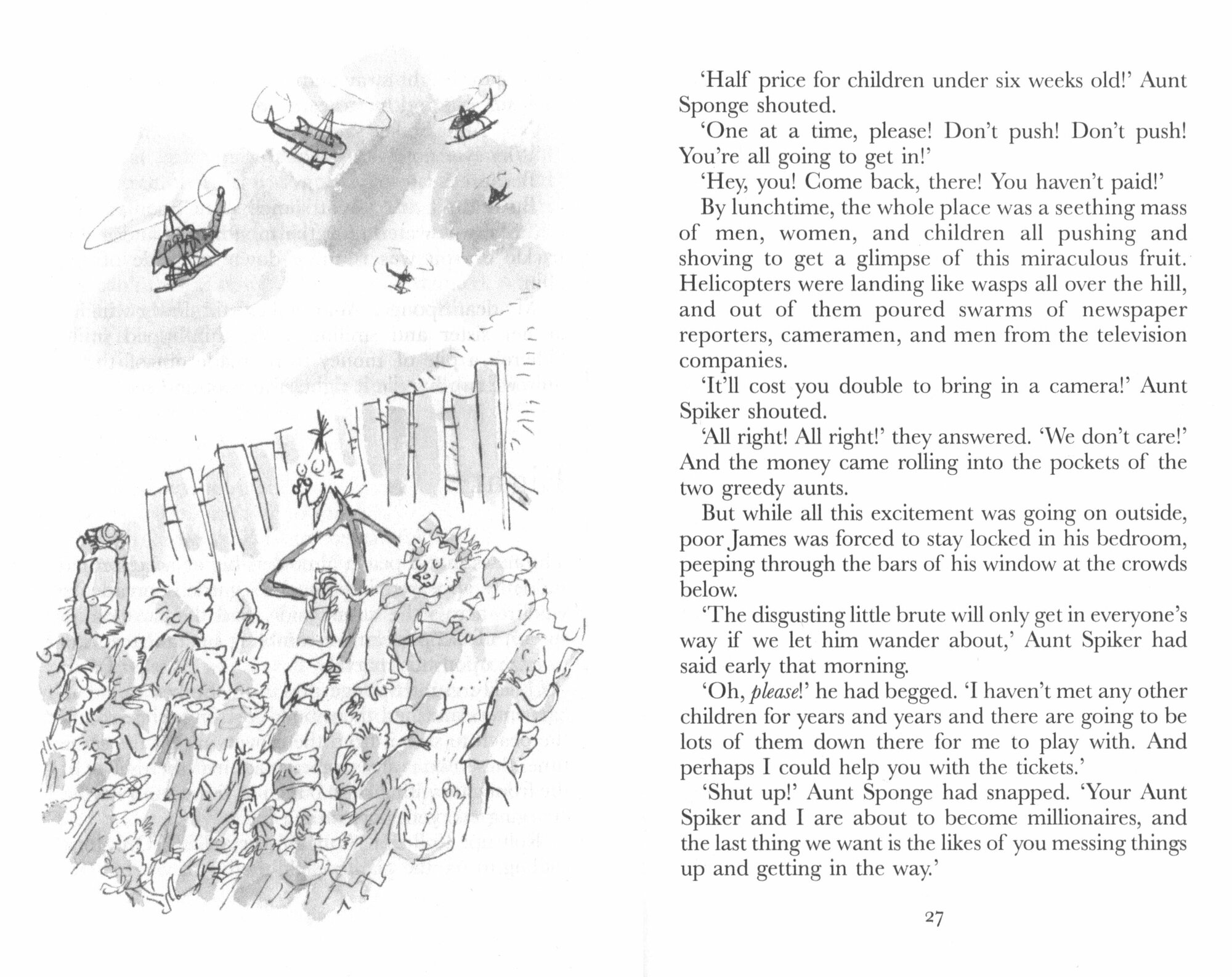 James Henry Trotter lives with two ghastly hags. Aunt Sponge is enormously fat with a face that looks boiled and Aunt Spiker is bony and screeching. He's very lonely until one day something peculiar happens. At the end of the garden a peach starts to grow and GROW AND GROW. Inside that peach are seven very unusual insects - all waiting to take James on a magical adventure. But where will they go in their GIANT PEACH and what will happen to the horrible aunts if they stand in their way? There's only one way to find out . .